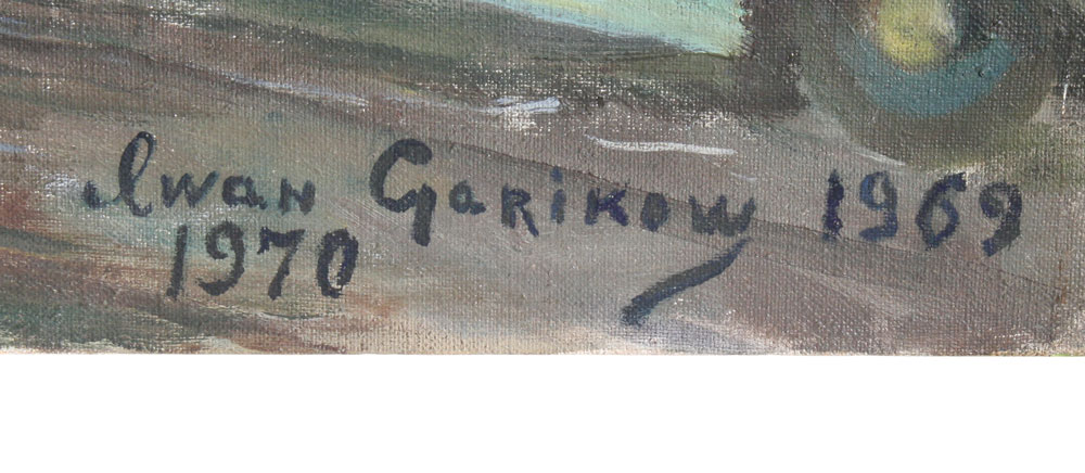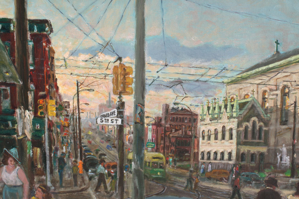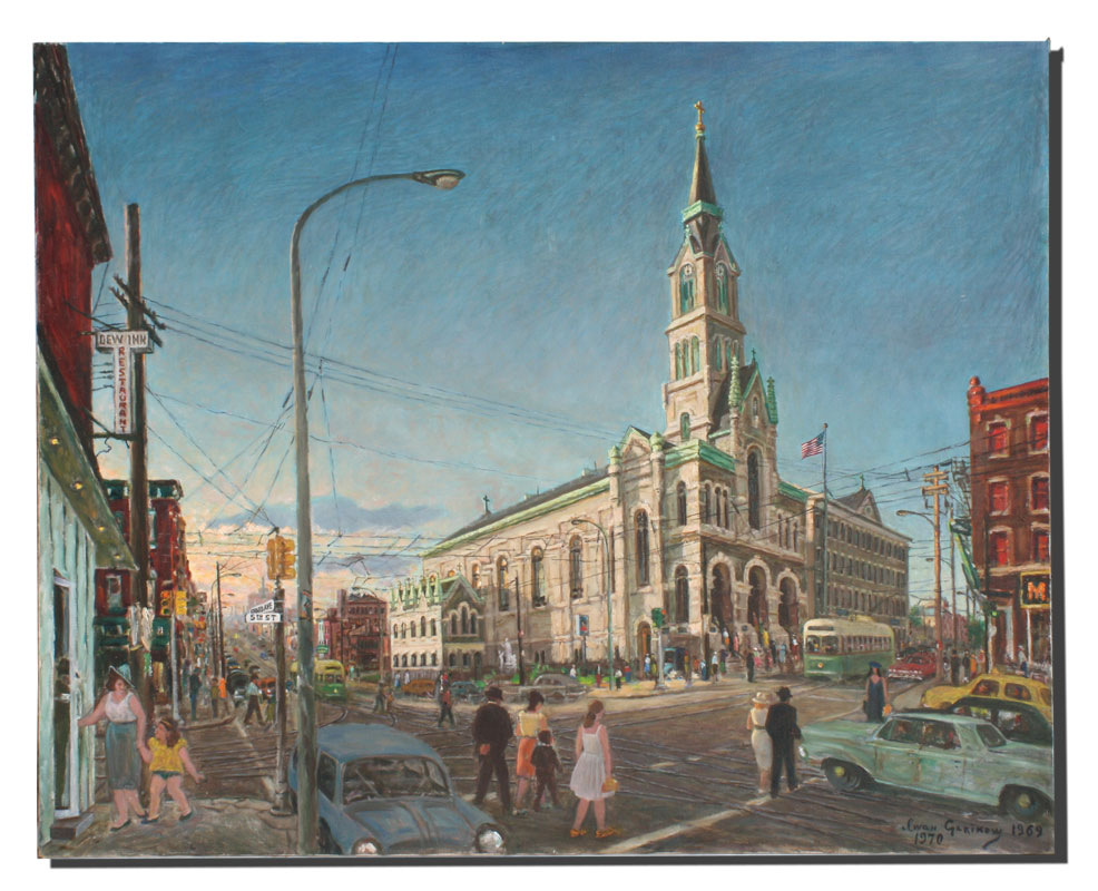 GARIKOW, Ivan I. (American/Austrian, 1918-1982): Large Street Scene of Saint Peter the Apostle Catholic Church in Philadelphia, Pennsylvania, 5th & Girard, in the Northern Liberties section of North Philadelphia, OIL/Canvas, 40 1/4'' x 50 1/4'', signed lower right, dated 1969-1970, unframed.