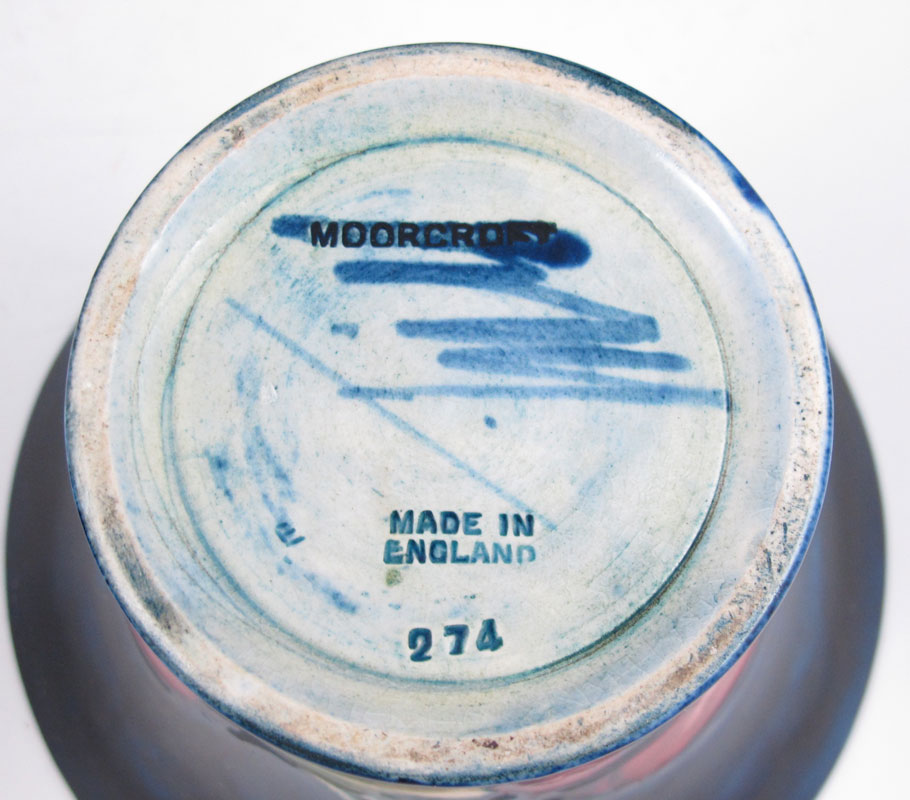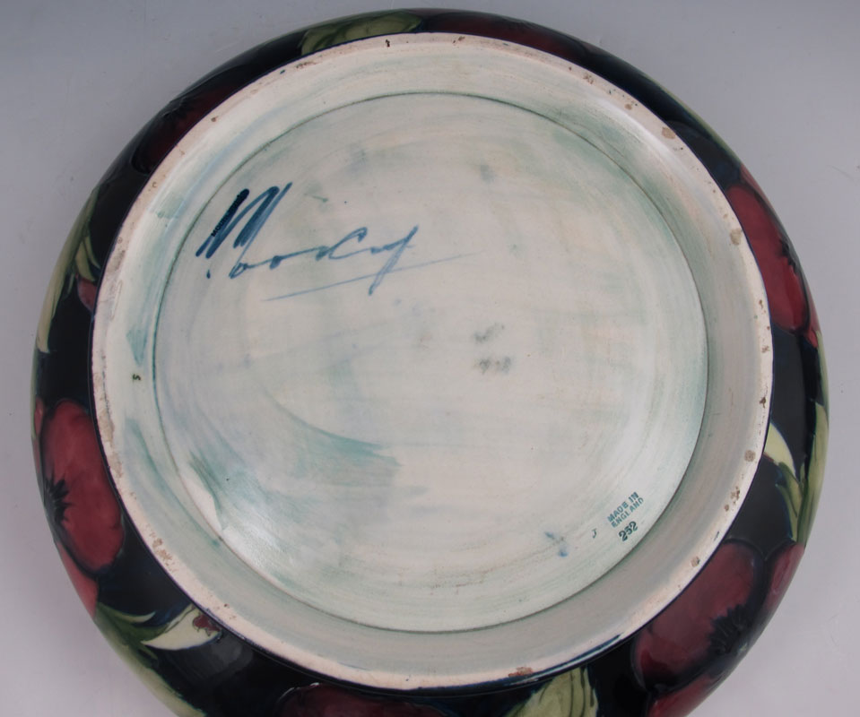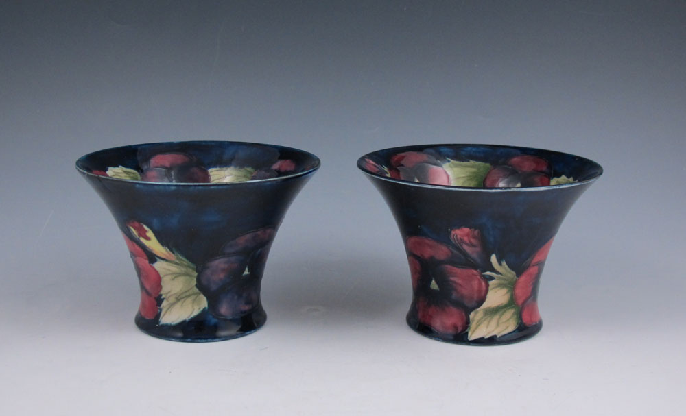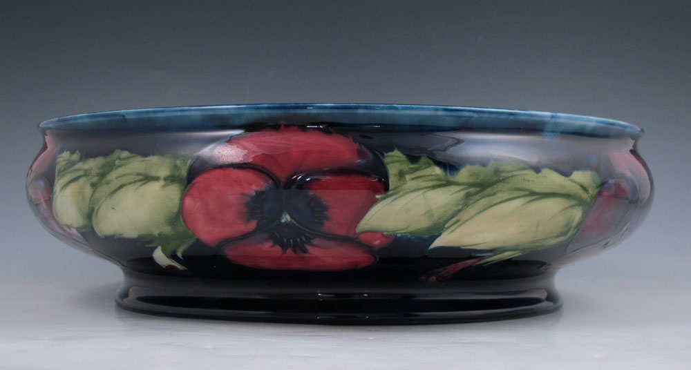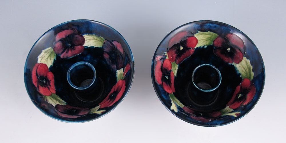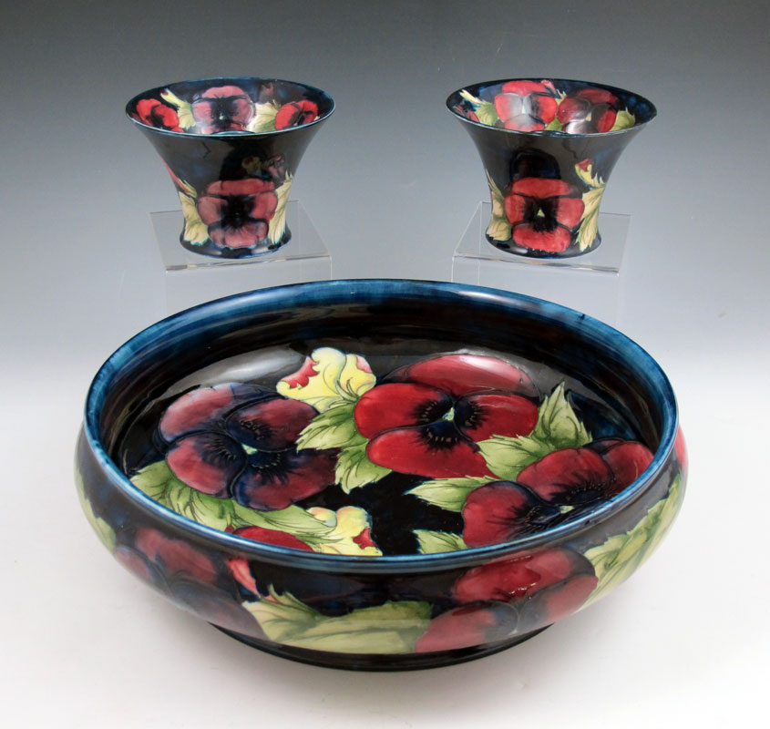 MOORCROFT PANSY CENTERBOWL & CANDLESTICKS: To include 1) Centerbowl with incised and painted pansies decoration. Impressed Moorcroft, Made in England, 252. 3 3/4'' h. x 12 1/2'' dia.. 2) Pair candlestands, matching incised and painted pansies design. Incised Moorcroft Made in England 274. 3 1/2'' h. x 5''
