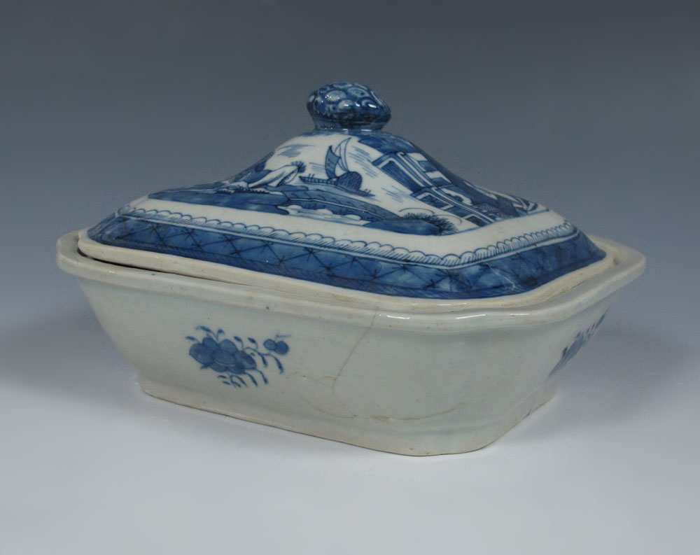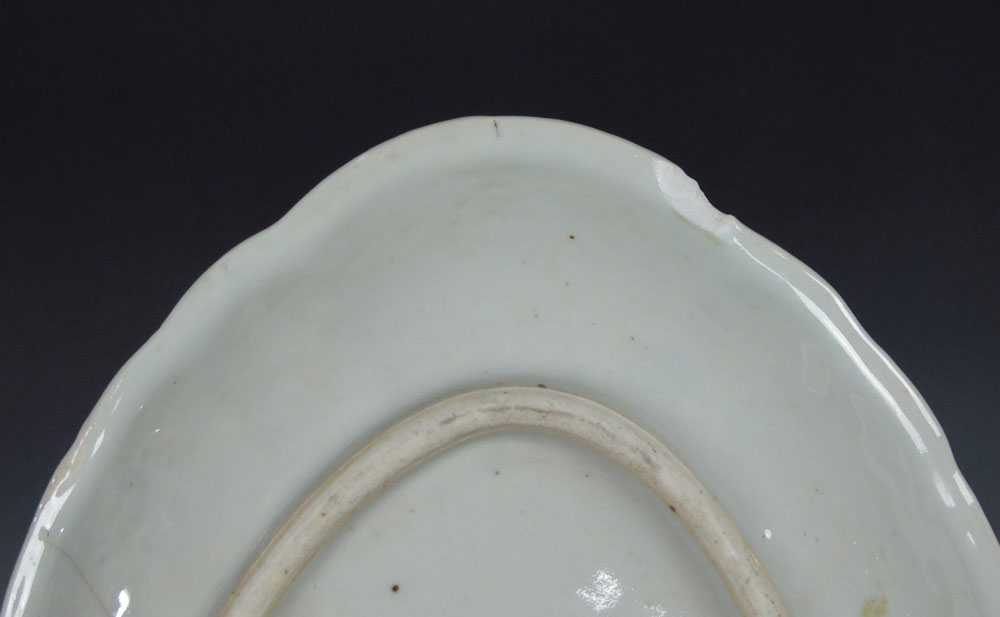 CONDITION: The covered dish and quatrefoil each have a hairline and chip.