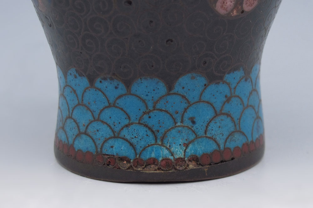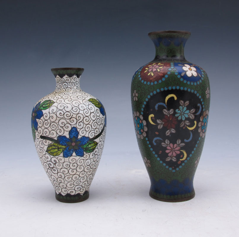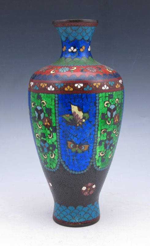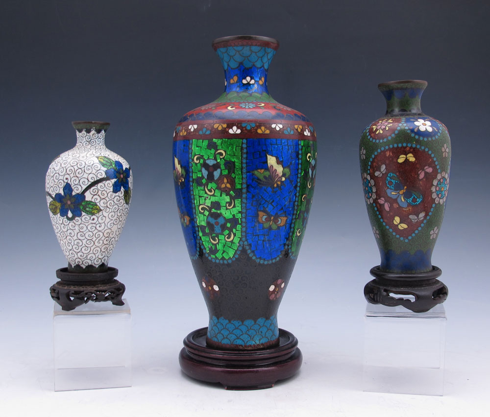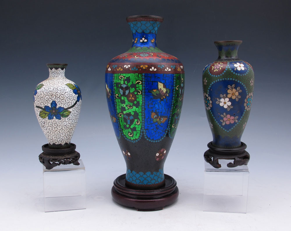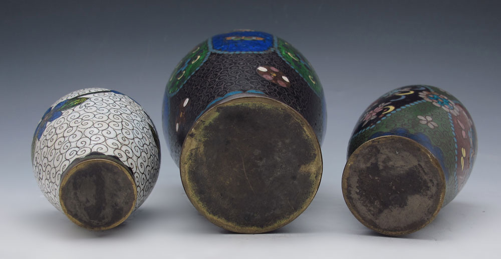 3 CLOISONNE VASES: 1) An 8'' Japanese Ginbari with good color, panels of flowers and moths, shows some wear. 2) Hint of Ginbari, dark ground, 5''. 3) A 4'' vase, white ground.