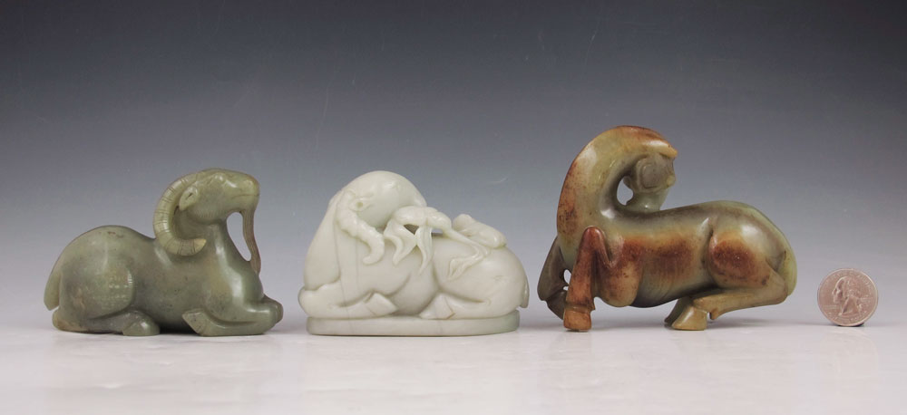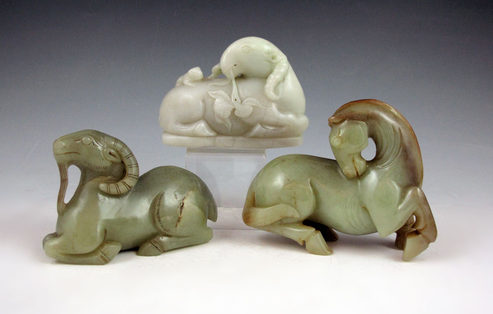 3 CHINESE HARD STONE FIGURAL CARVINGS HORSE & RAMS: Nephrite horse and two rams, Approx. 4''l. x 3'' tall.