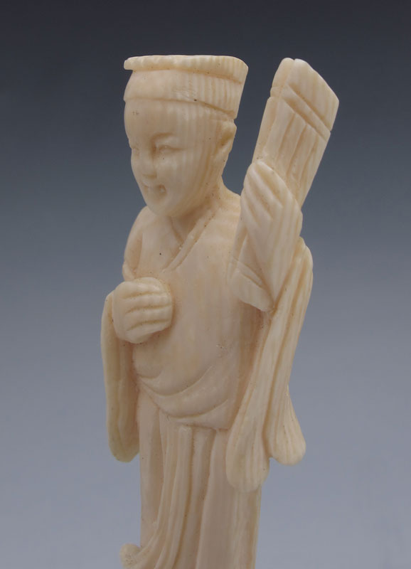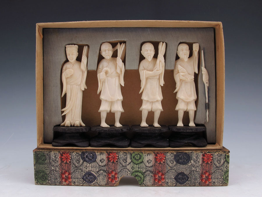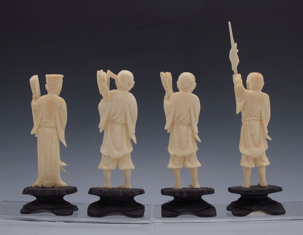 4 CARVED IVORY FIGURES IN PRESENTATION CASE: Figures depict scholar, farmers and fisherman. mounted to wood bases, each 3 3/4'' h. Comes in glass top presentation case, 1 3/8'' h. x 7'' x 4 5/8''.