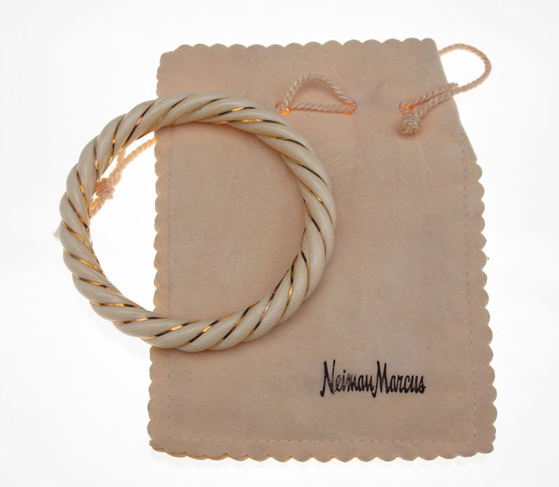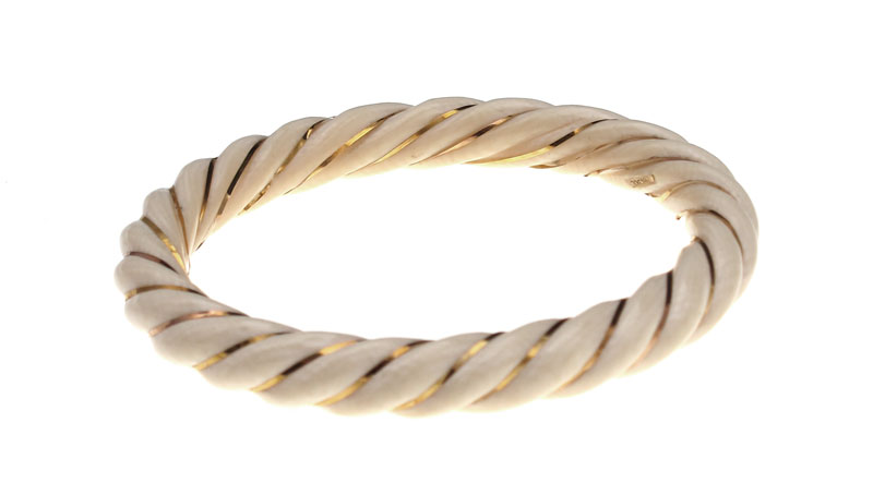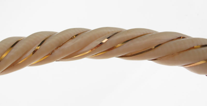 IVORY BANGLE BRACELET: Spiral carved ivory bangle bracelet. The spiral is wrapped with gold wire. Round shaped. Approx. 2 ½'' diameter.