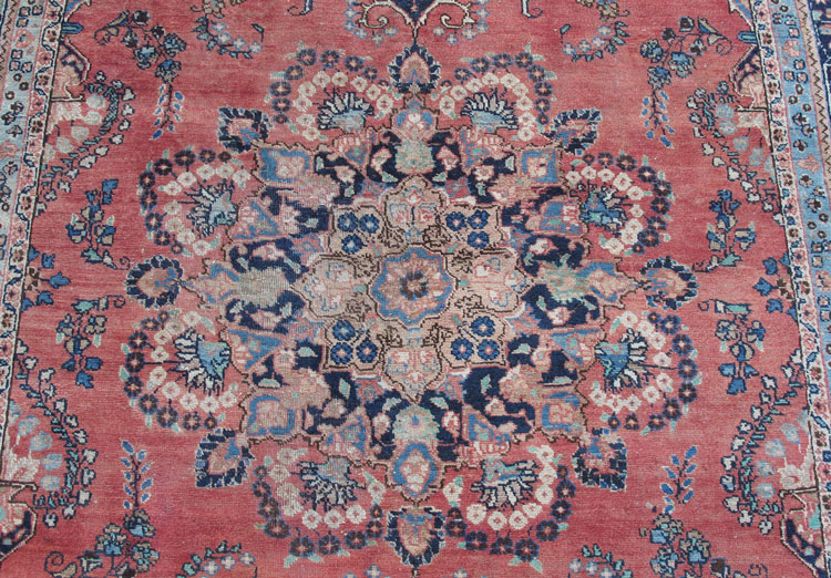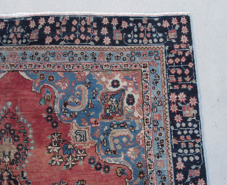 SEMI-ANTIQUE PERSIAN HAND KNOTTED WOOL RUG, 5'6'' x 8'7'': This classic design medallion with pendants rug has a salmon red field and medium blue corners surrounded by a medium blue guard border and a midnight blue ground main border that has sprays of flower-heads in contrasting colors. It is a beautiful rug that has been reduced professionally at some time in its life. There should be another guard border on the outer edge of the main border. However, the overall effect of the rug is still very pleasing.