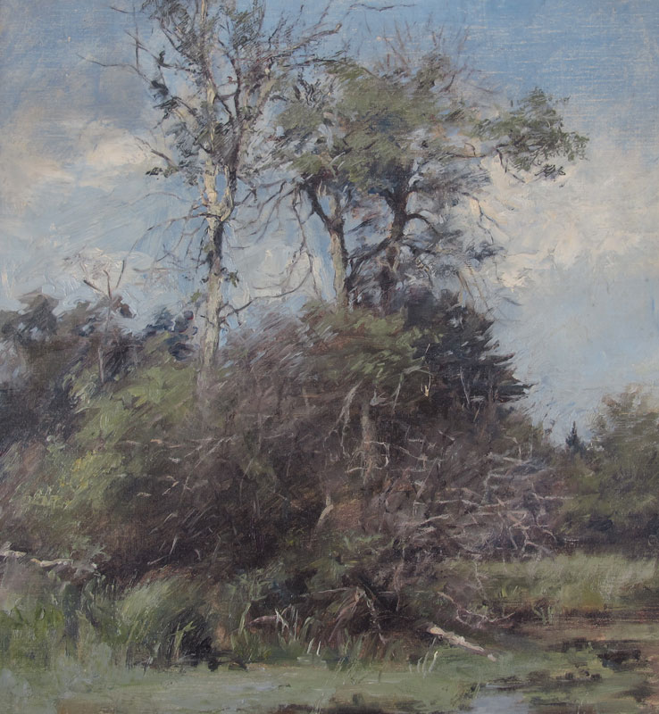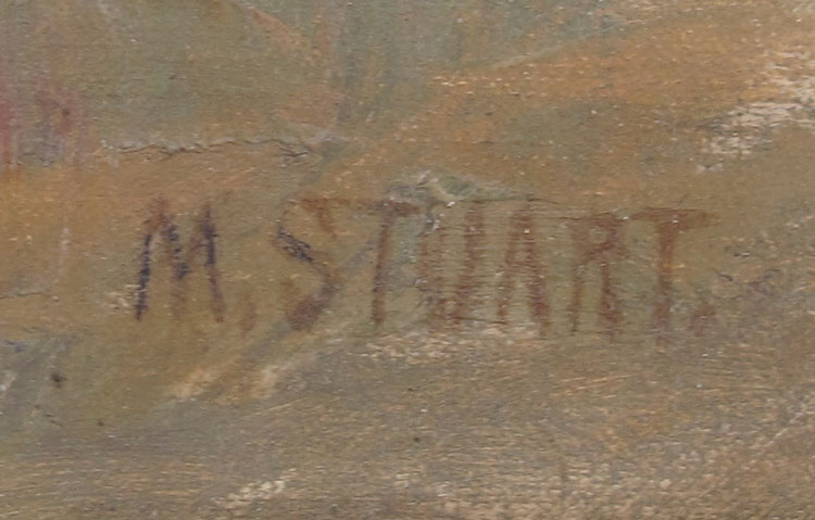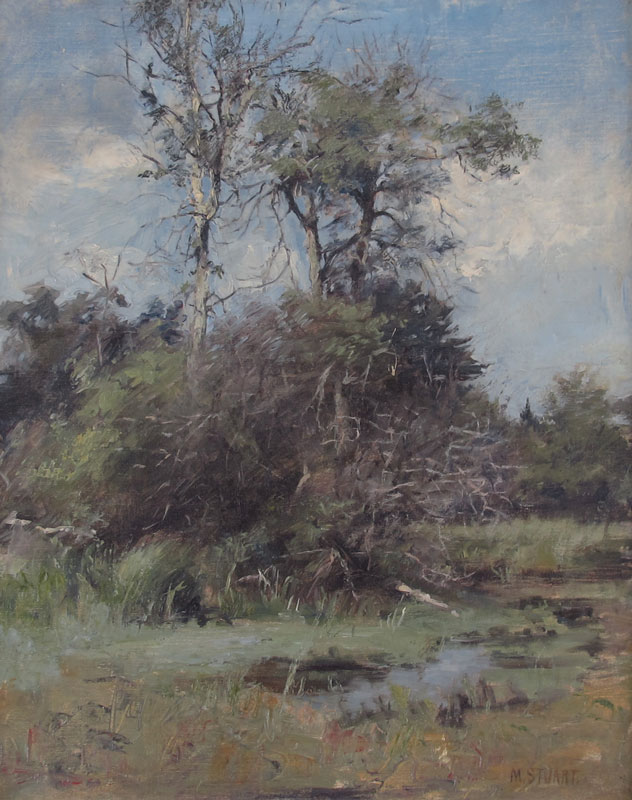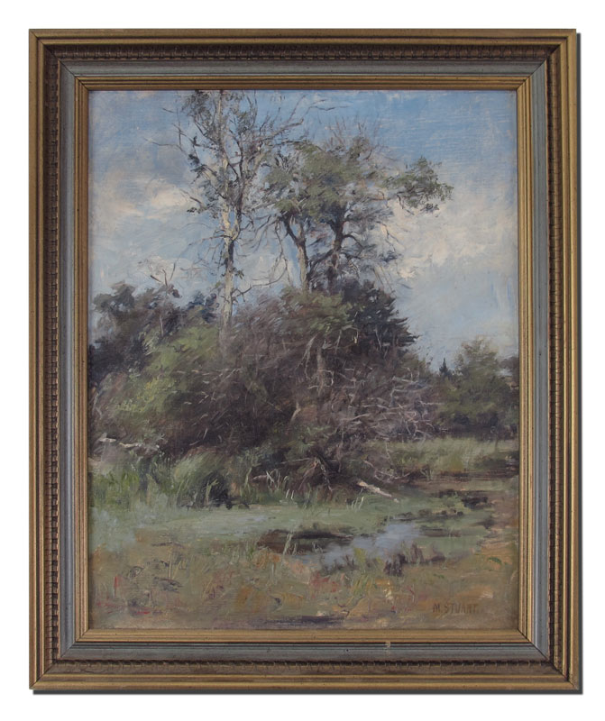 VERY GOOD IMPRESSIONIST LANDSCAPE WITH STREAM SIGNED M. STUART: Oil/Canvas, 20'' x 16'', framed, 23'' x 19 1/2''.