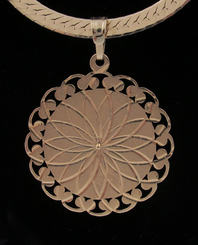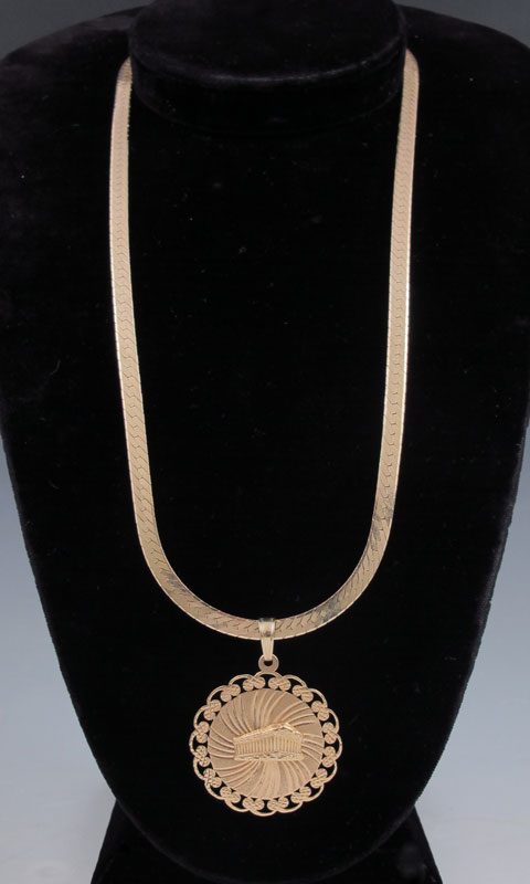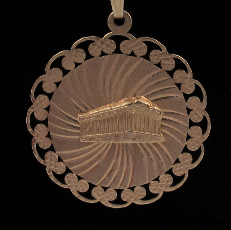 14K GOLD MEDALLION PENDANT AND CHAIN: 14K yellow gold ''Parthenon'' pendant with Herringbone chain. Length: 20'' Weight: 25.1 grams.