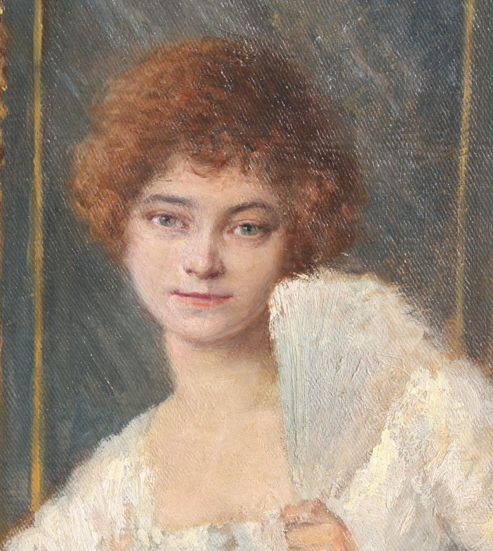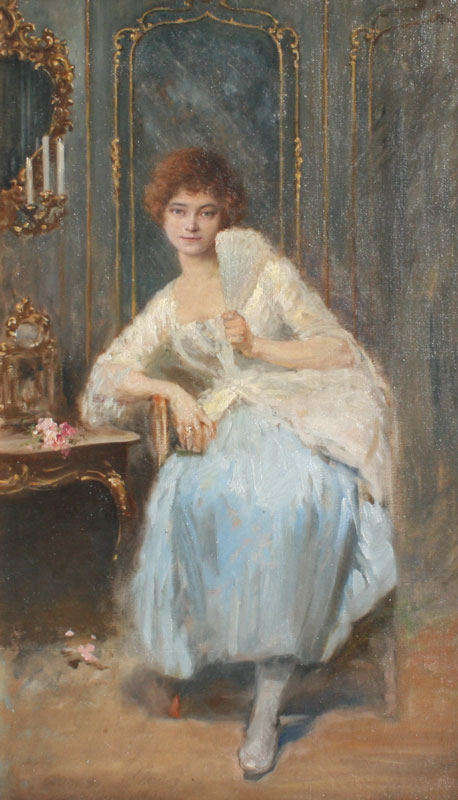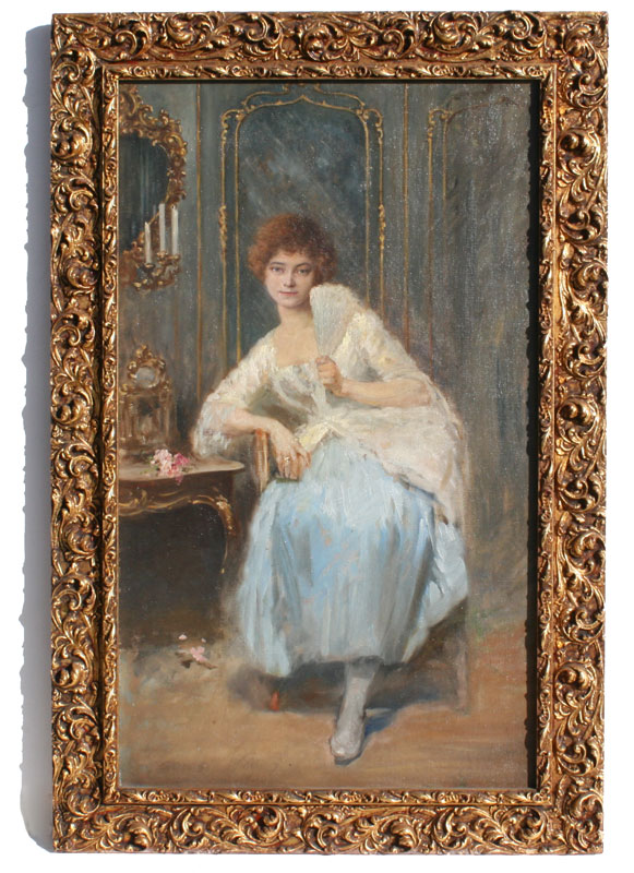 BLAAS, Eugen von, AFTER, (Italian/Austrian, 1843-1931): Portrait of a Young Girl Seated in Interior with Fan, OIL/Canvas Mounted on Board, sight size 30 1/2'' x 18 1/2'', signed lower right, dated 1902, painted and gilded frame, 38'' x 25''.