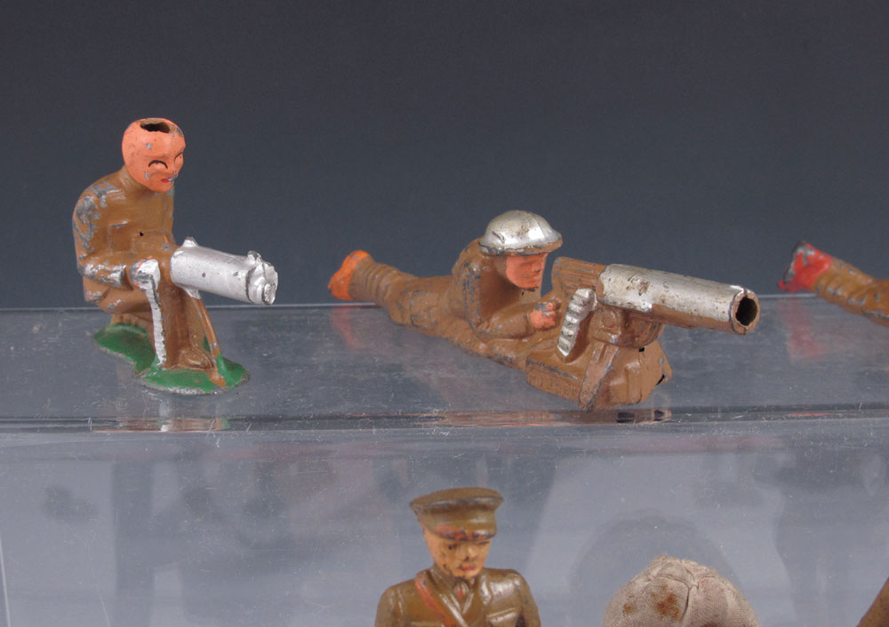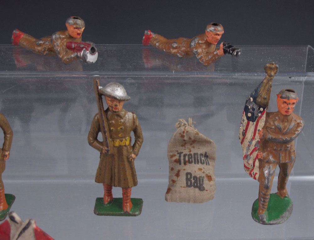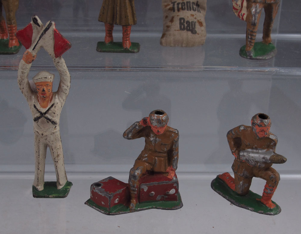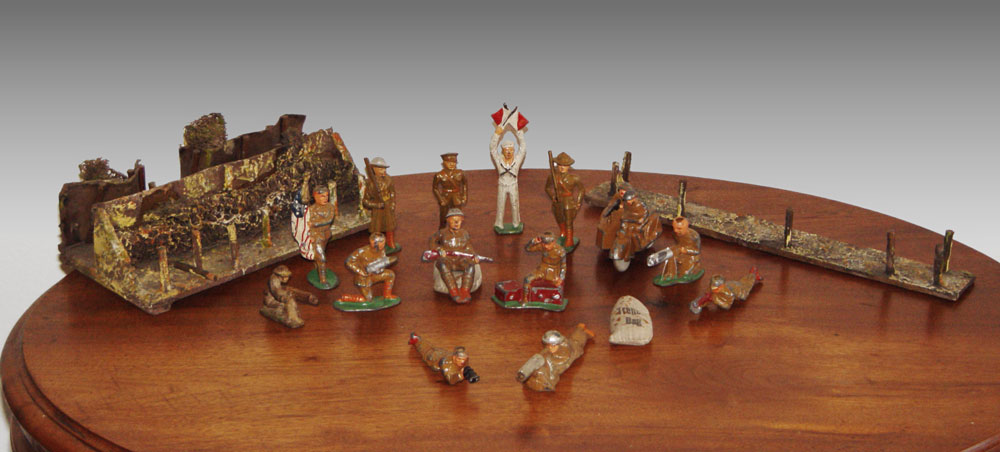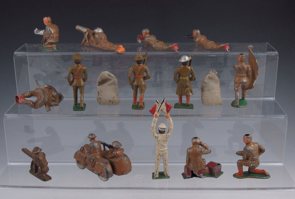 16 PIECE SOFT METAL TOY SOLDIER FIGURINES: Soldiers include motorcycle with sidecar, signalman, soldier with American flag, radioman and more.