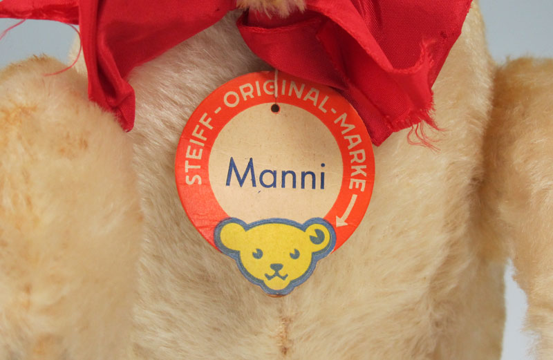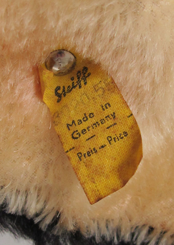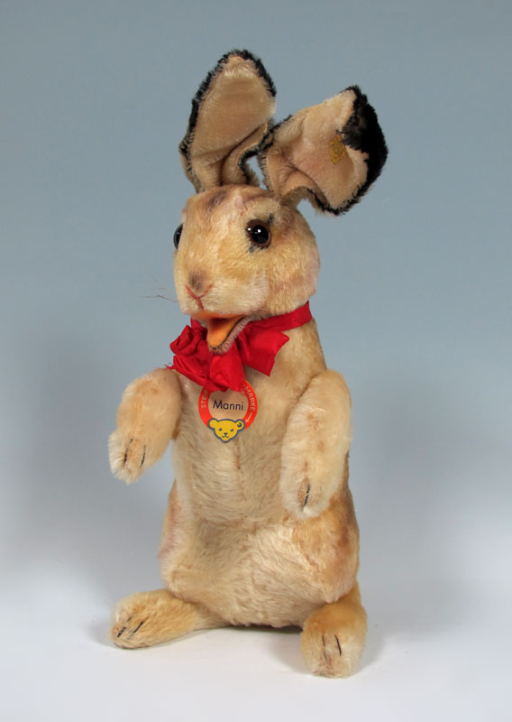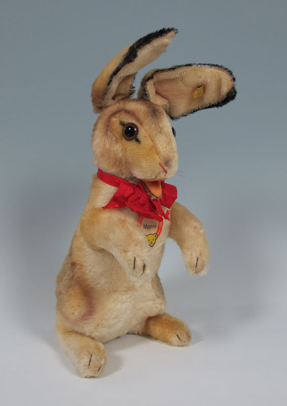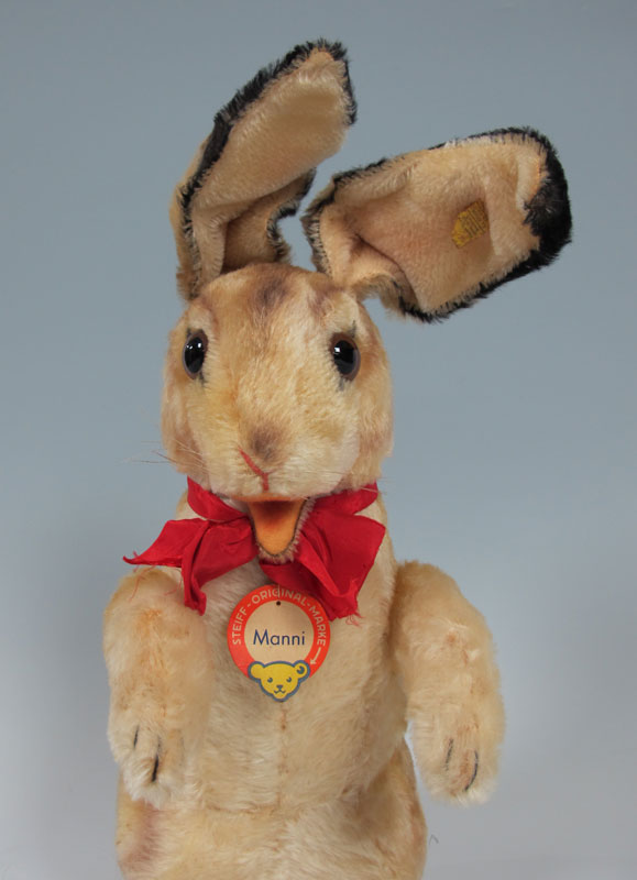 LARGE STEIFF MANNI RABBIT WITH BUTTON: Has original button & tag, 3090.56? 20'' h. x 8'' x 9 1/4''.