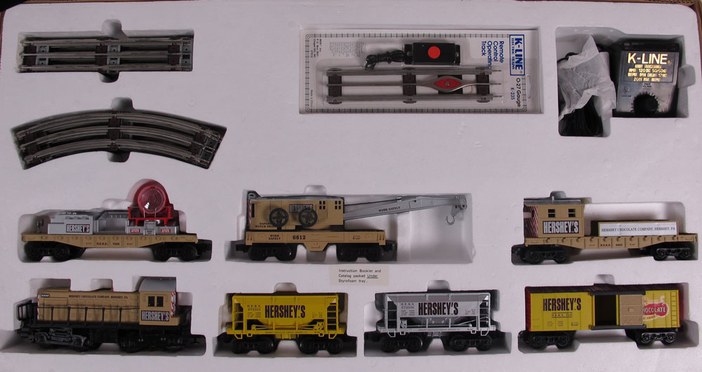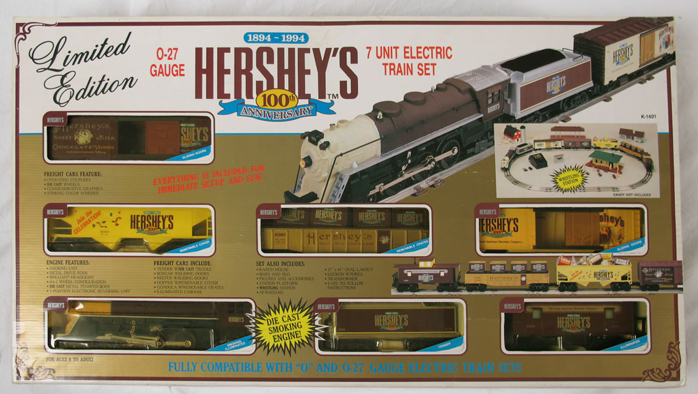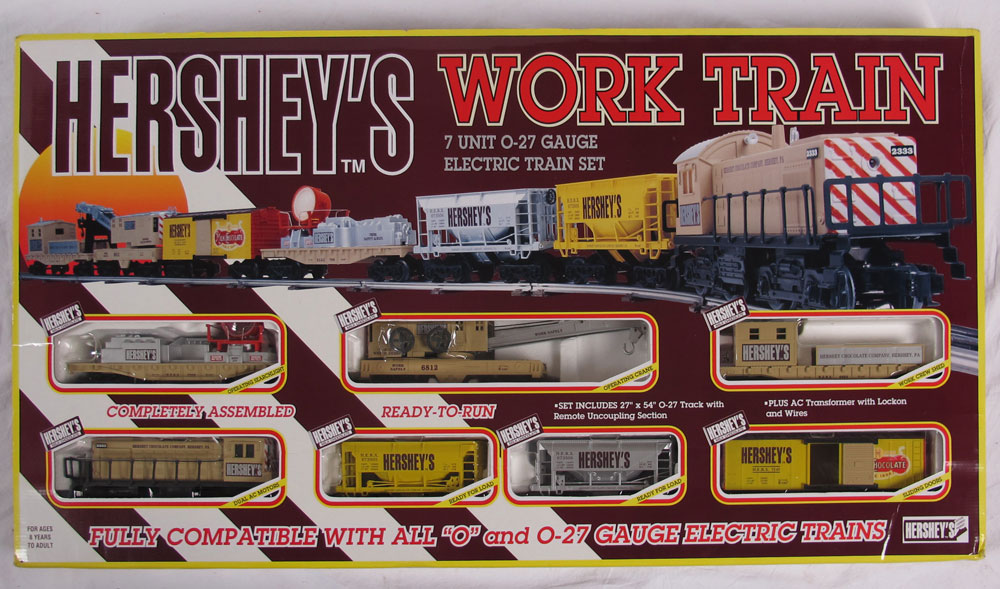 2 PIECE HERSHEY K-LINE O GAUGE TRAIN SETS: To include 1) Hershey ''Work Train'' #1517, 7 piece set, diesel locomotive, crane car, searchlight car, boom car with shed, transformer and 27'' x 54'' oval track. Circa 1995, with original box, non original plastic wrap. 2) Hershey ''100th Anniversary'' #1401, 7 piece set, steam locomotive 4-6-2, Hershey crates for gondola, ranch house, barn, silo, station platform, ''Whistling'' station, figures, newsstand, transformer and 27'' x 45'' oval track. Circa 1984. In original box.
