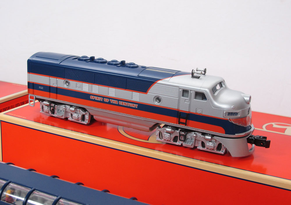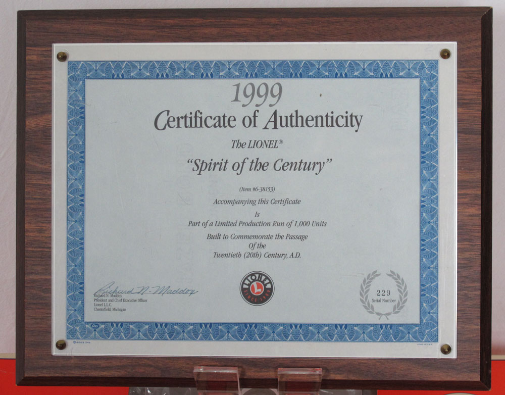 LIONEL SPIRIT OF THE CENTURY TRAIN SET: Limited edition #229/1000 with COA. Sold with 38154 power engine; 38155 non power engine; 39110, 39111, 39112 Full vista dome cars; 39113 solarium observation. All sold with original boxes and original shipping box.