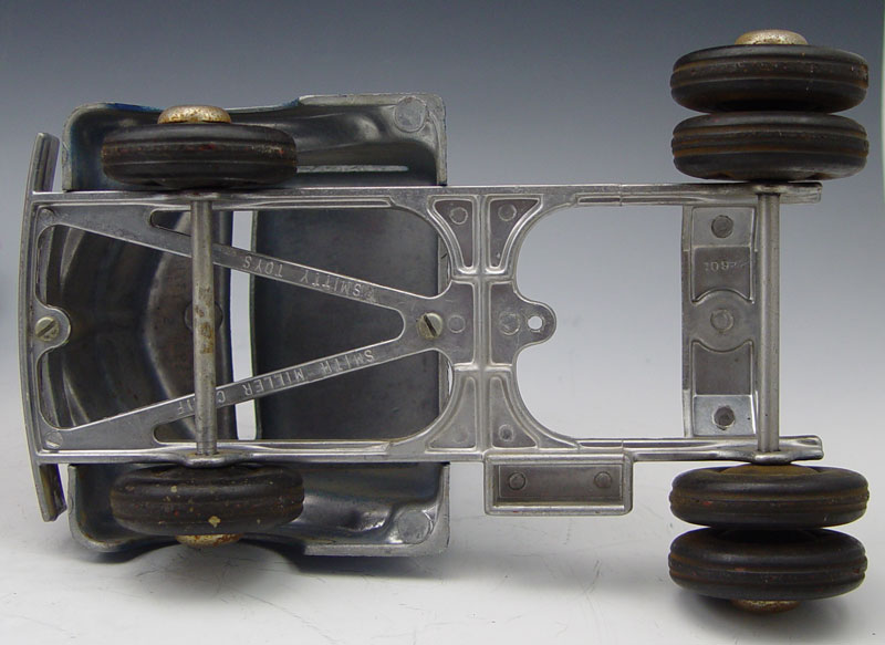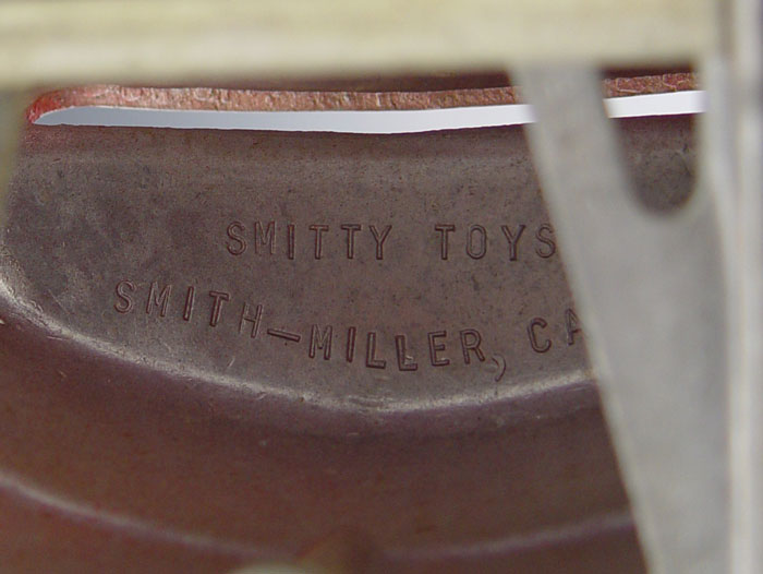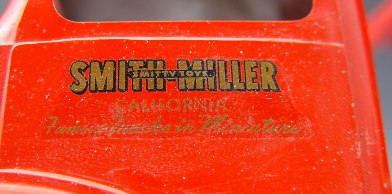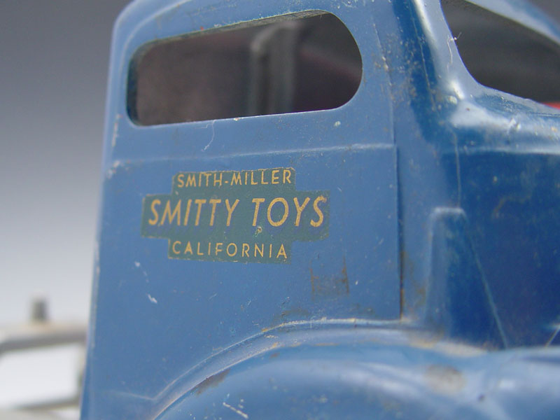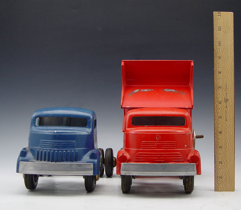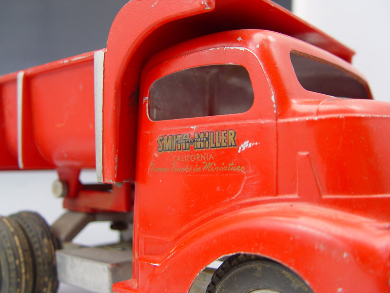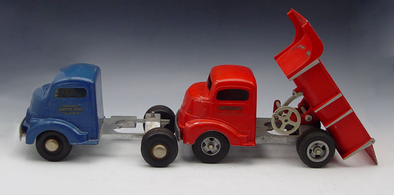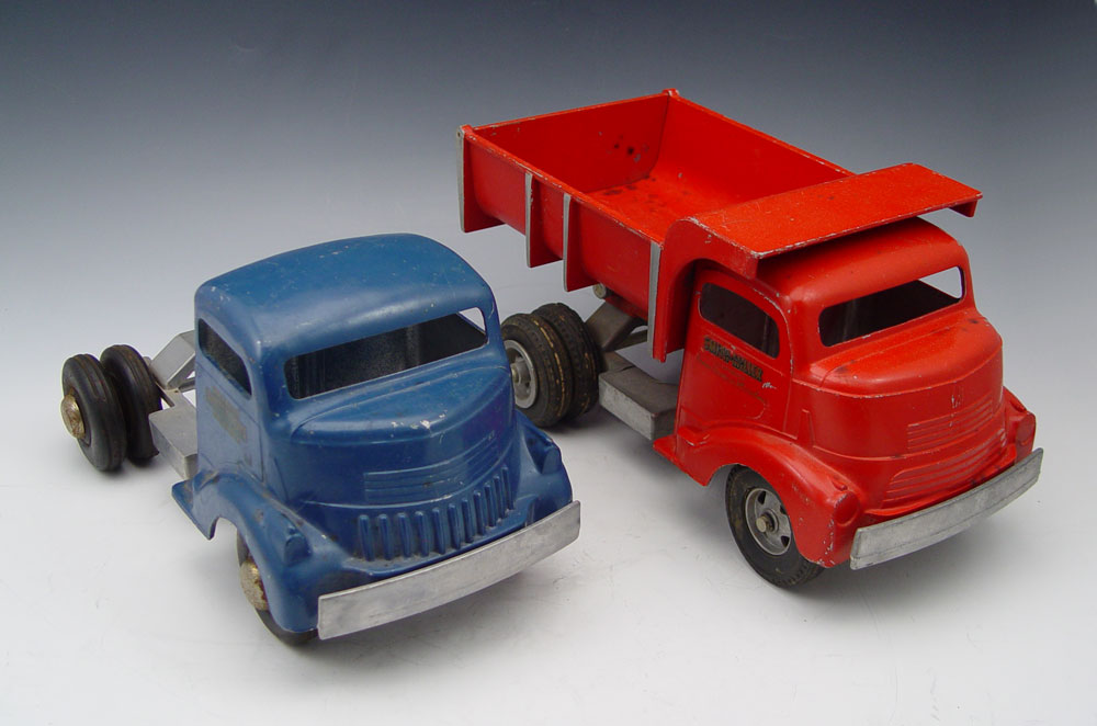 2 PIECE SMITH MILLER PRESSED STEEL TRUCKS: To include 1) Red Dump truck, 6 1/4'' h. x 113/4'' x 6 1/4''. 2) Blue truck cab, 5 1/2'' x 10'' x 6 1/2''. Both have original paint and decals.