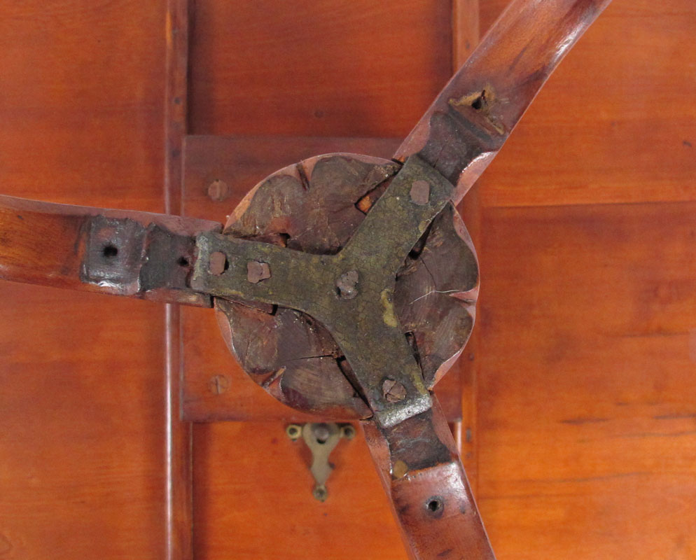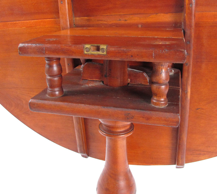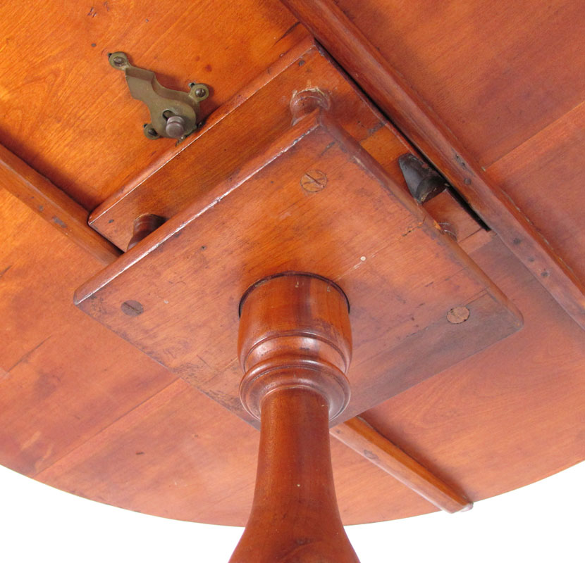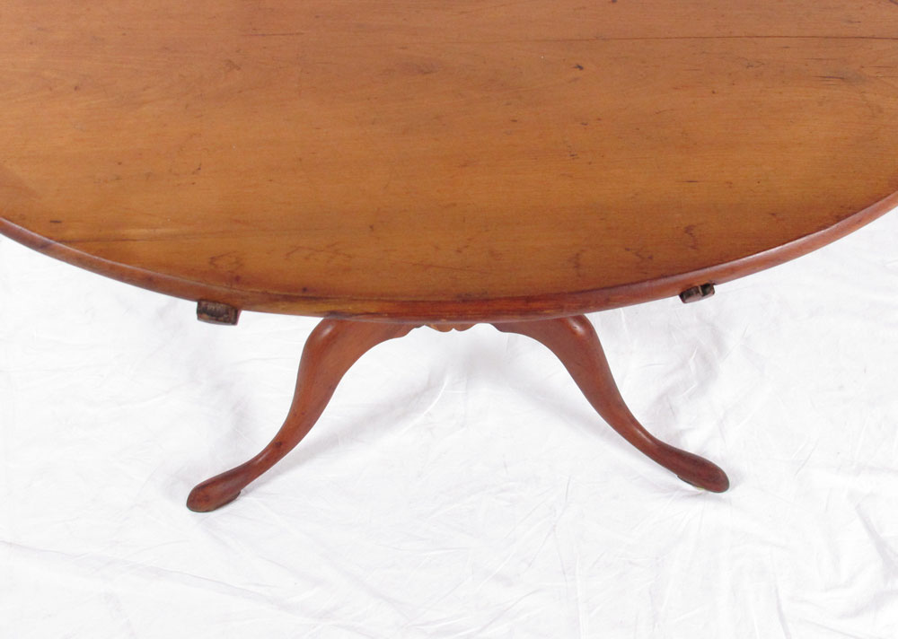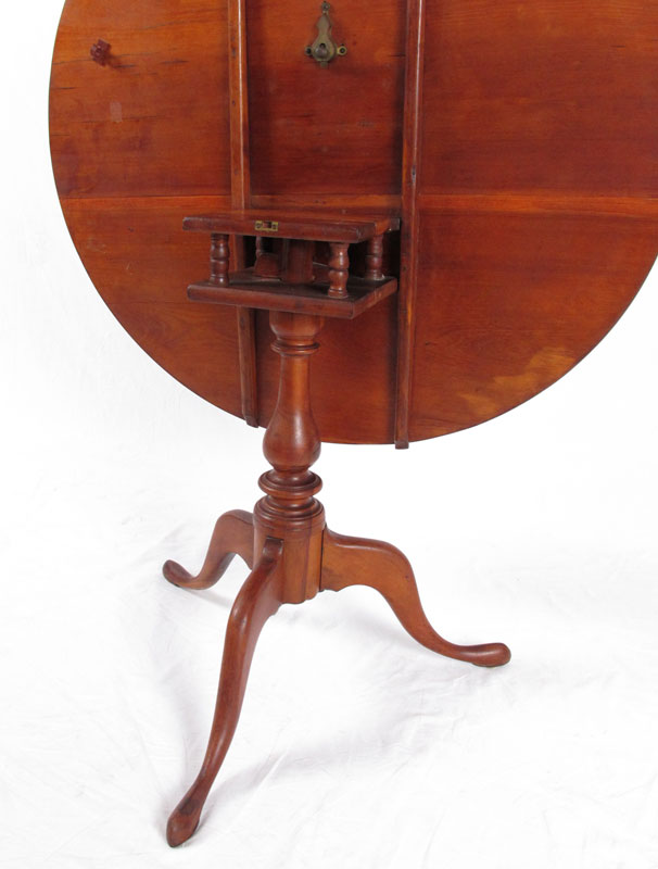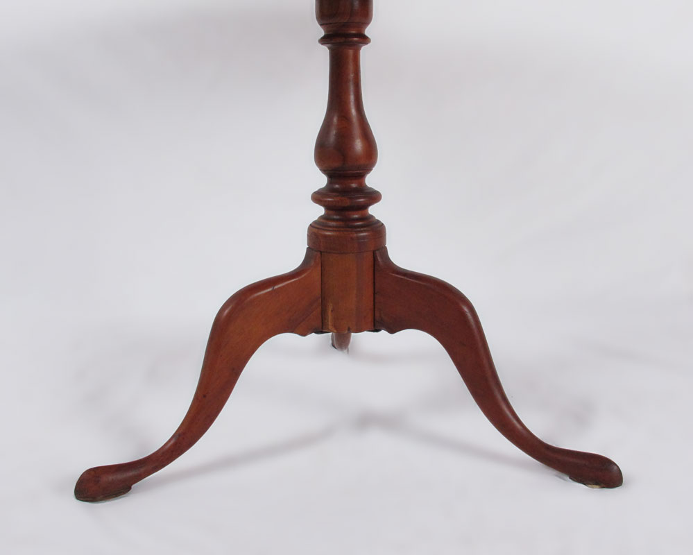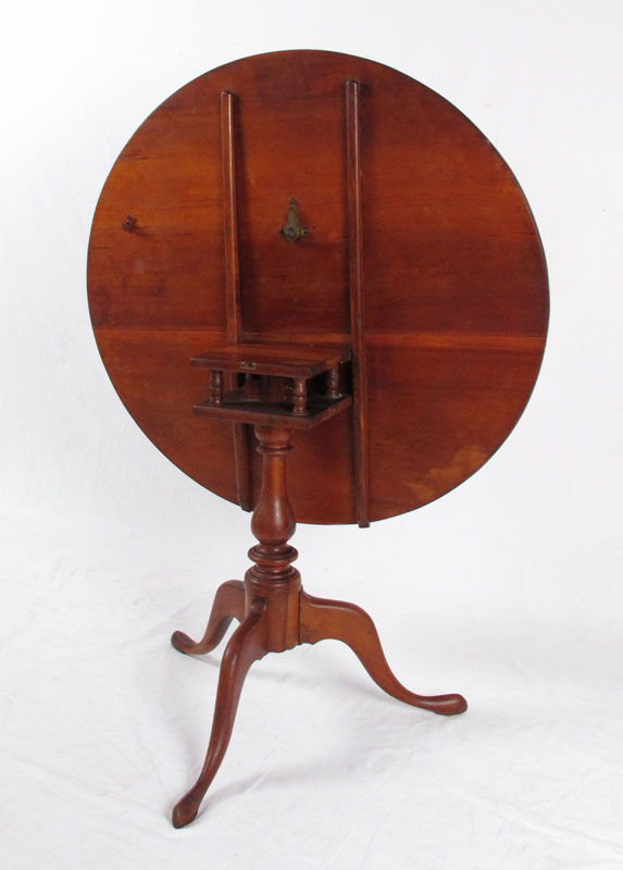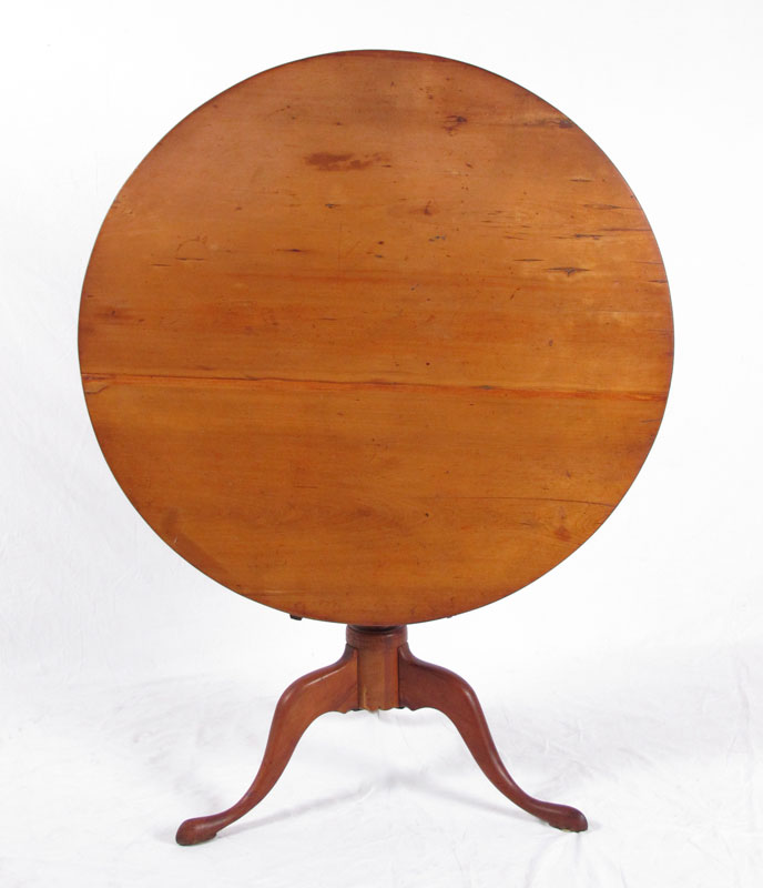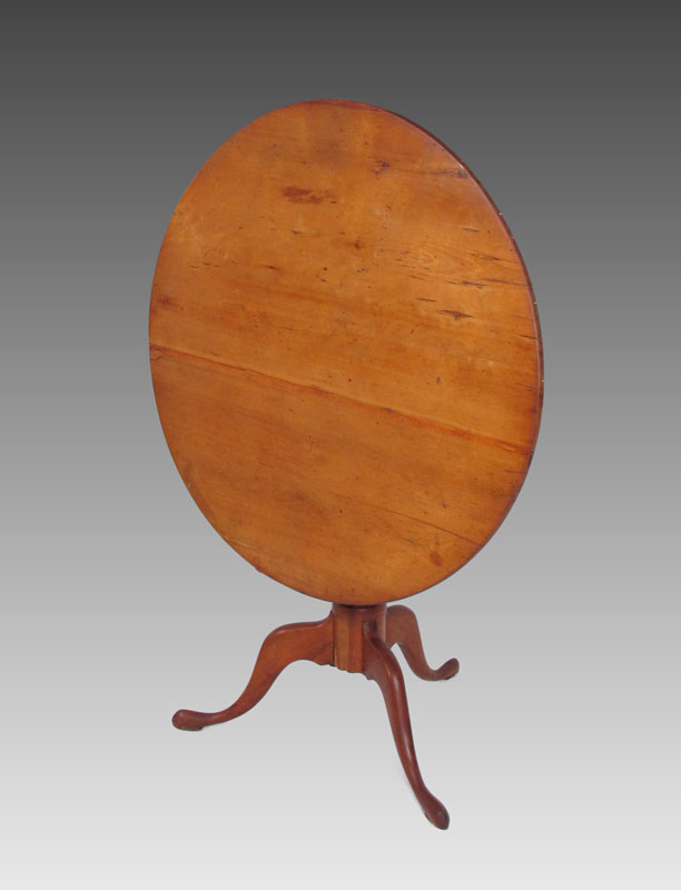 EARLY TILT TOP BIRDCAGE TABLE: American, Queen Anne Period candle stand with round tilt top above a bird cage, central turned pedestal and tripod form legs terminating on slipper feet. Approx. 26 1/2'' x 32 3/4'' dia.