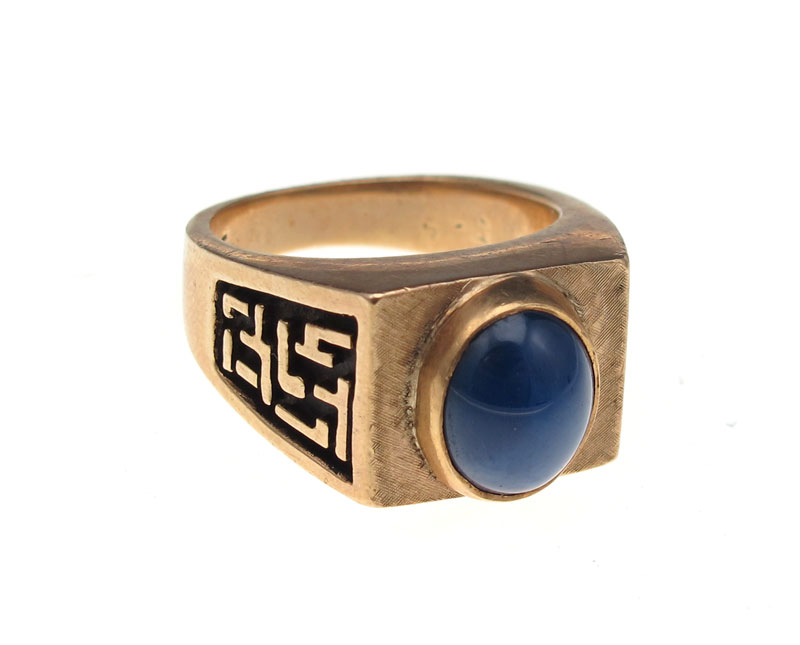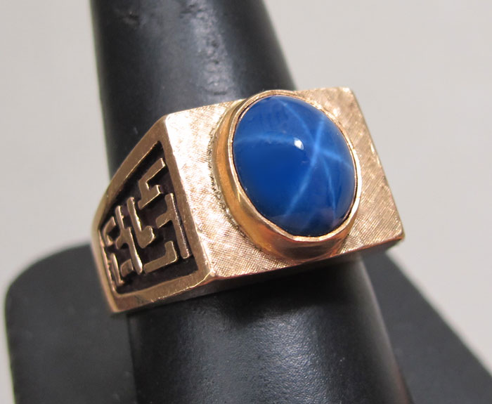 GENTS 14K STAR SAPPHIRE RING: 10K yellow gold ring contains one 11.00 X 7.00 mm oval synthetic star sapphire. Weight: 16.2 grams. Size: 10
