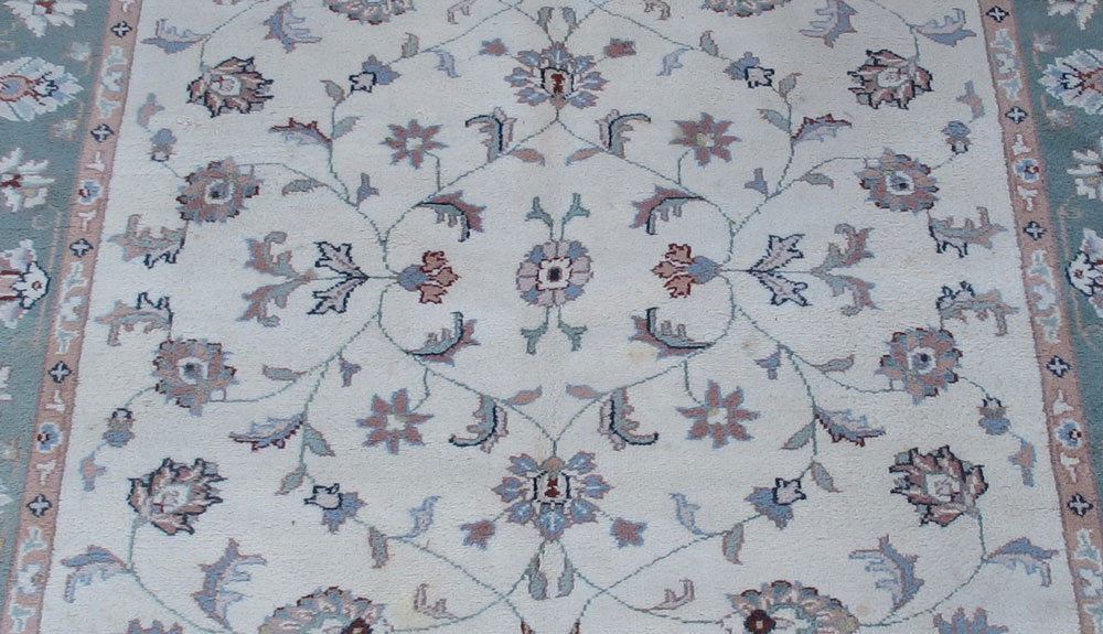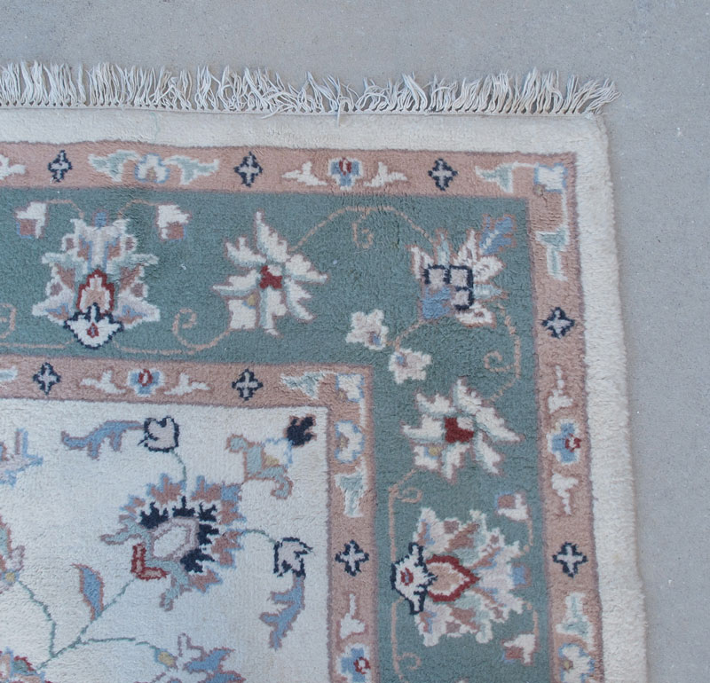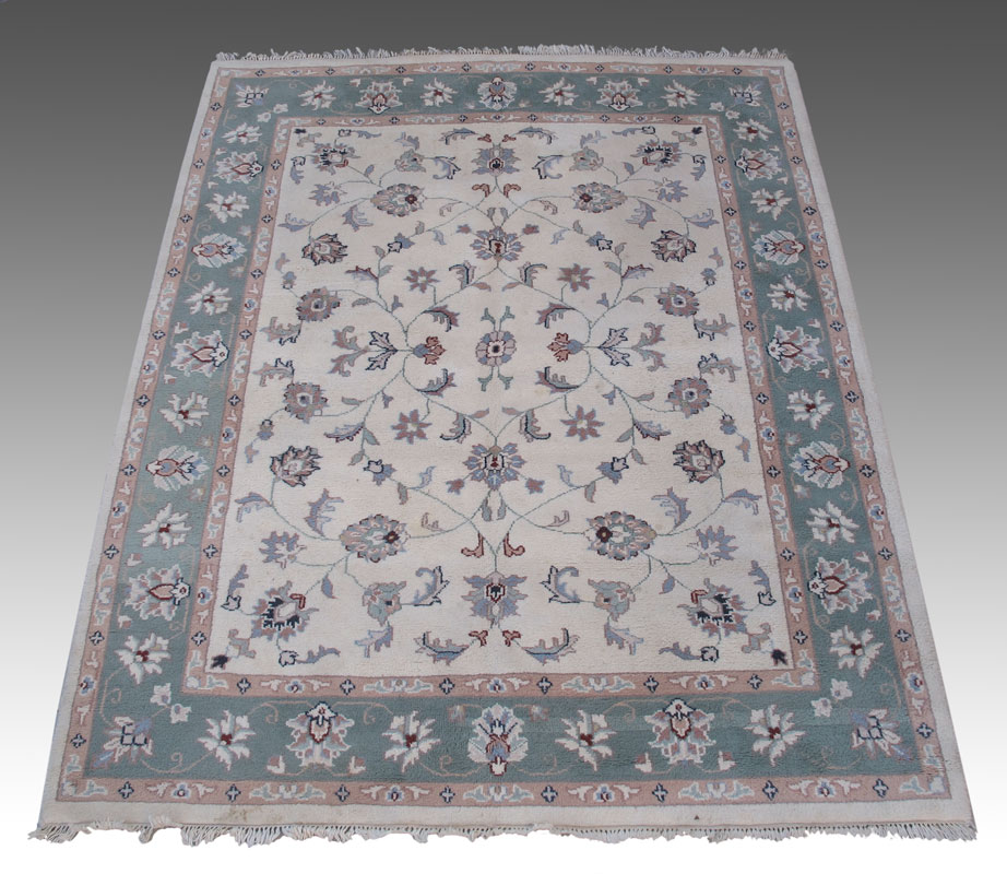 INDO-PERSIAN HAND KNOTTED WOOL RUG, 7'8'' x 9'9'': This ivory field rug with a pale green main border features an open tracery design in pale peach/pink, minty green and pale blue of vines connecting leaves and palmettes over the whole field. The motif is also found in the main border of the rug with the colors reversed from the field. The overall effect is very pleasing. The condition of this modern coarsely woven rug is very good.
