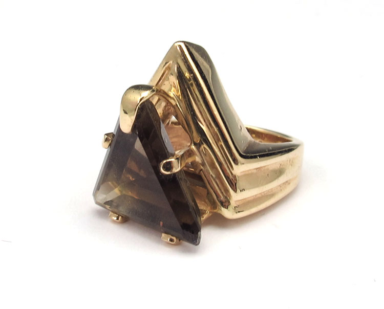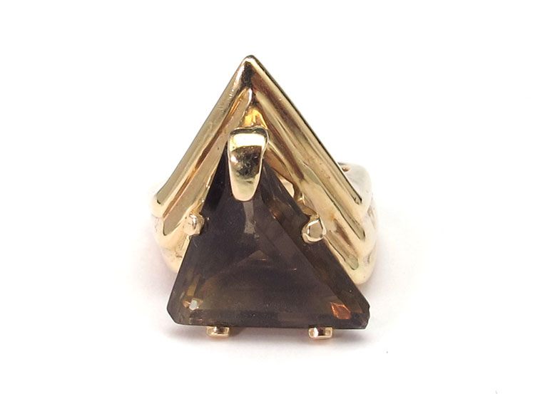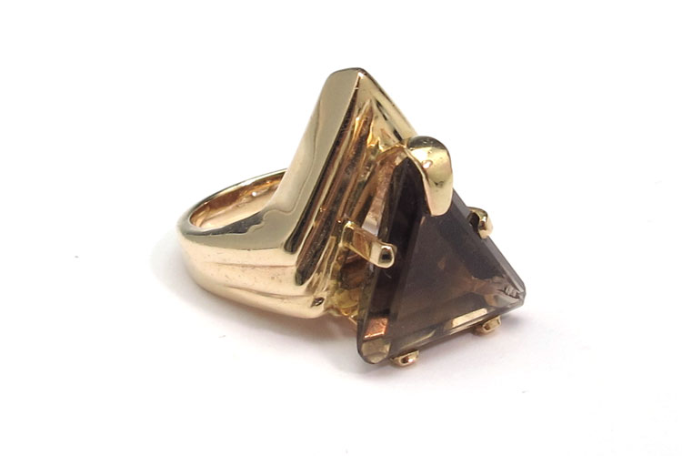 14K SMOKY QUARTZ RING: 14K yellow gold ring contains one triangle shaped smoky quartz (chipped). Weight: 4.00 Ct. Approx. The quartz is prong set. Size: 3.5 Weight: 11.1 grams.