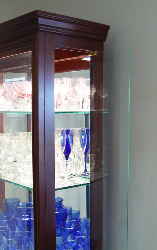 PULASKI GLASS FRONT AND SIDES DISPLAY CABINET: Lighted display with multiple adjustable glass shelves, side door openings, 79 3/4''h. x 43''w. x 15''d. overall.
