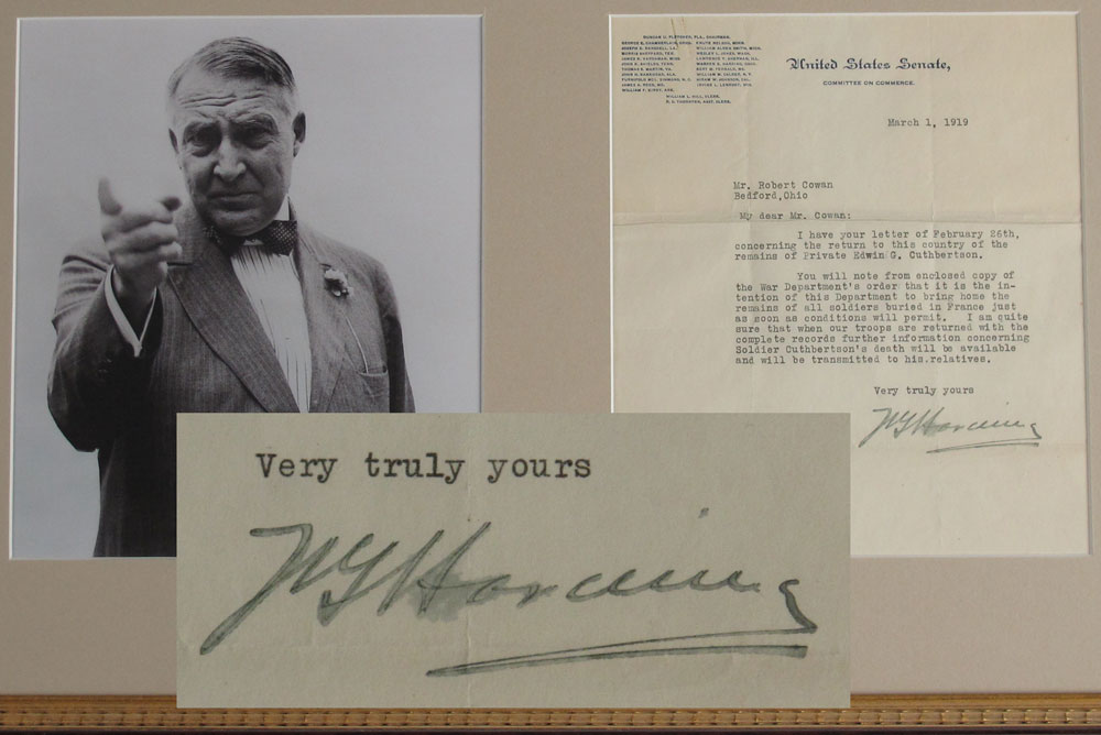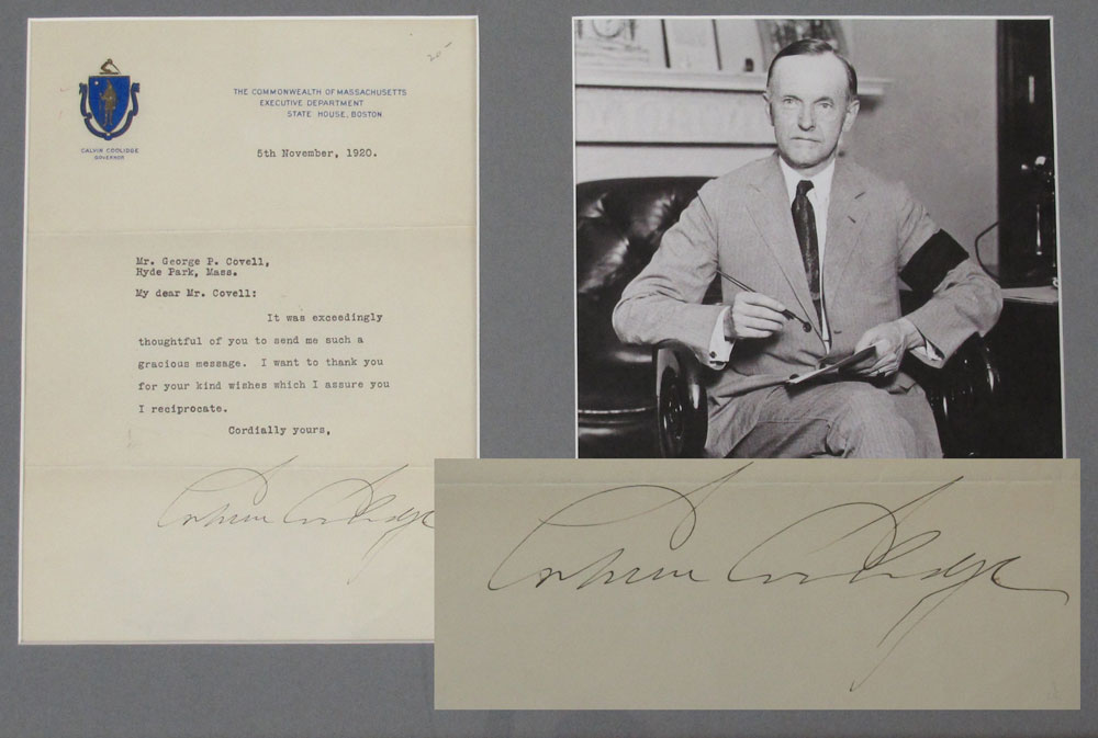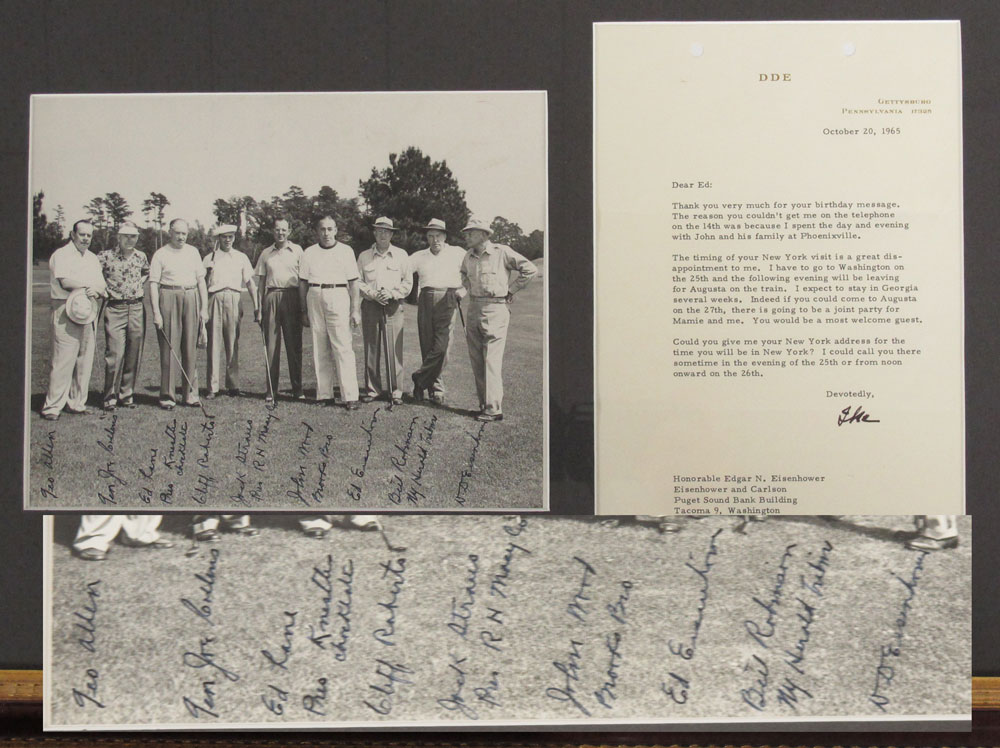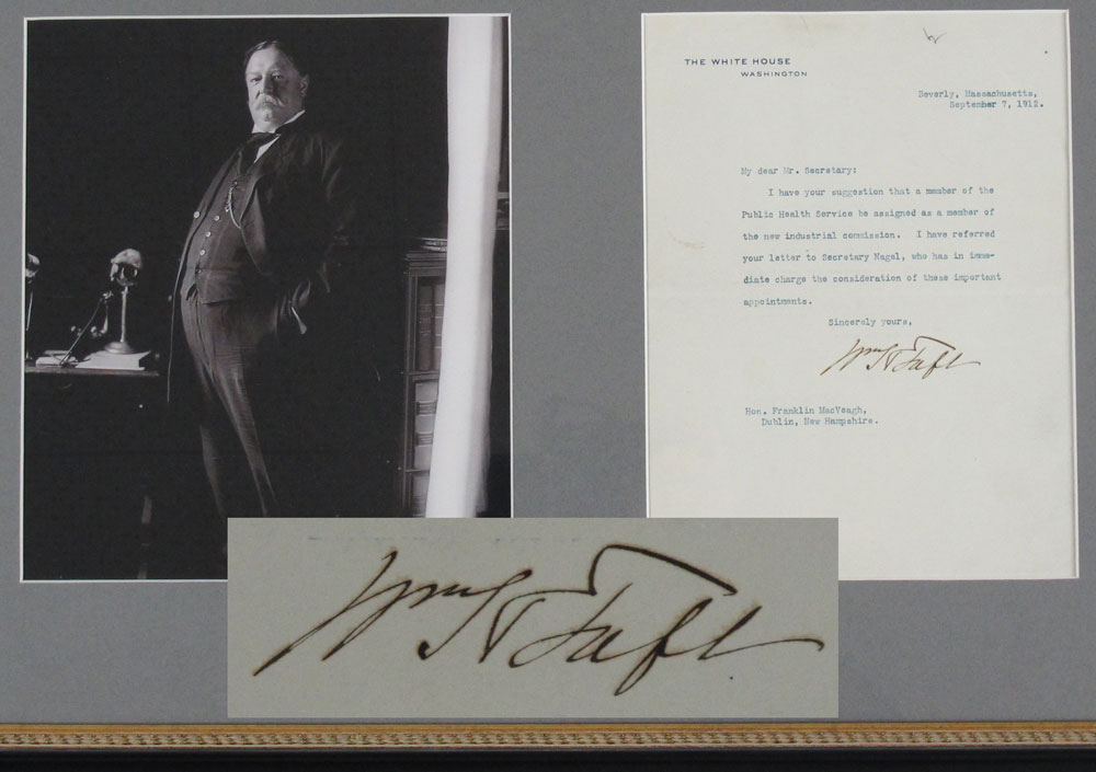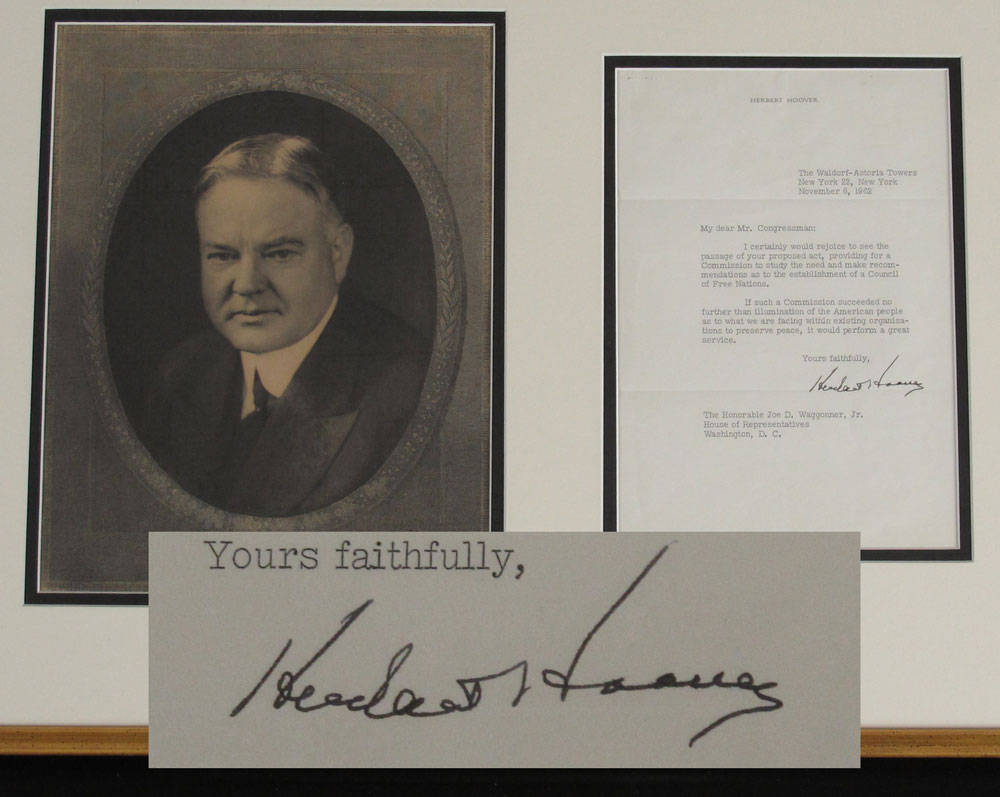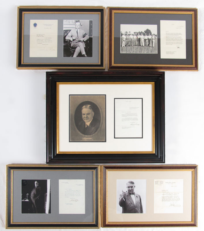 COLLECTION OF 5 FRAMED PRESIDENTIAL SIGNED LETTERS: To include Herbert Hoover, Calvin Coolige, Warren G. Harding, William Howard Taft, Dwight D. Eisenhower. All are signed on typed letters, framed with photographs of the president. None are on White house stationary. Not examined out of frame. Largest frame measures 23'' x 29 3/4''.