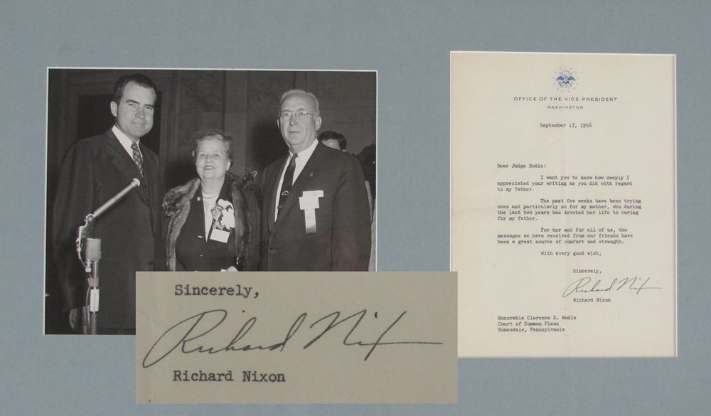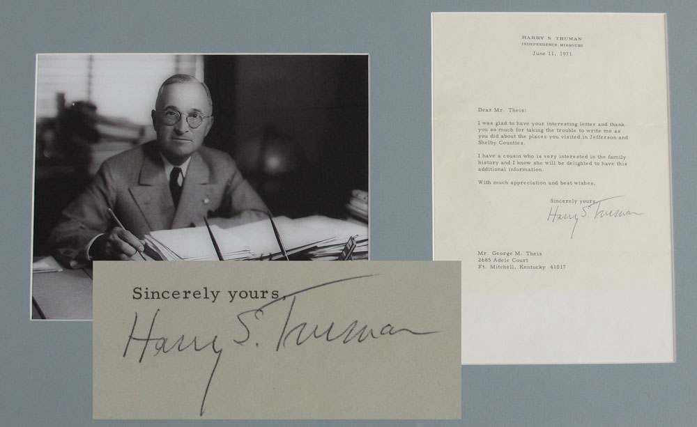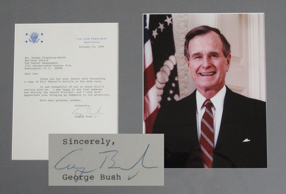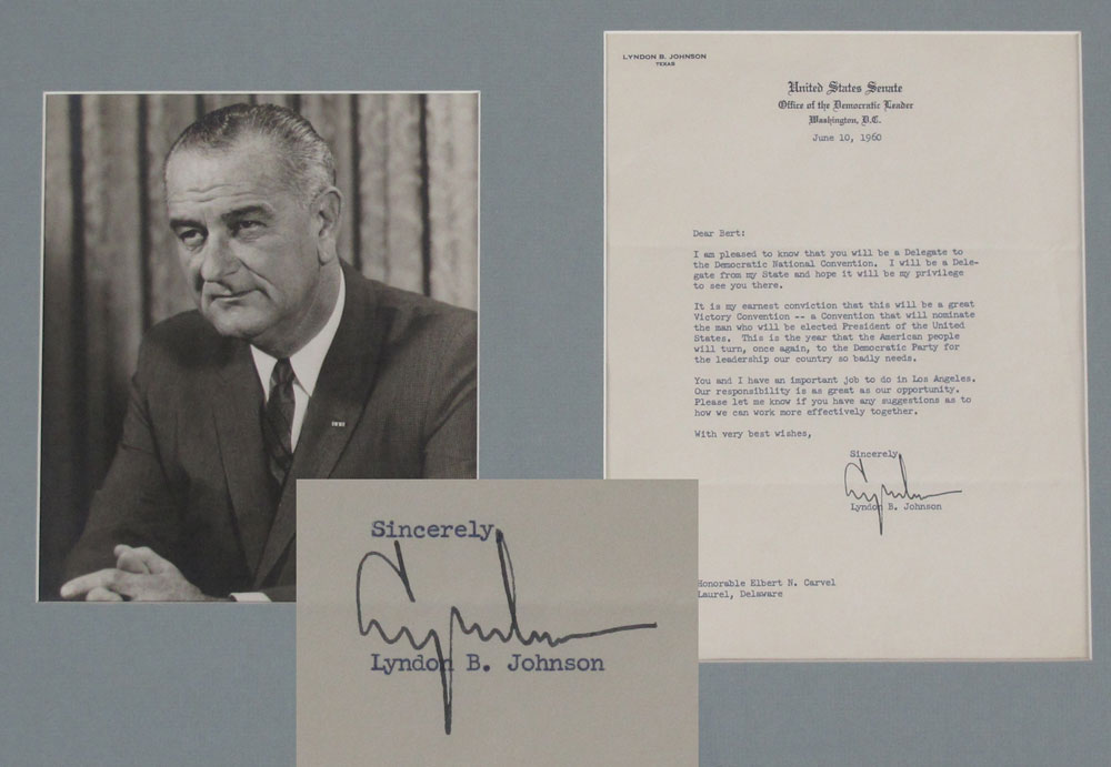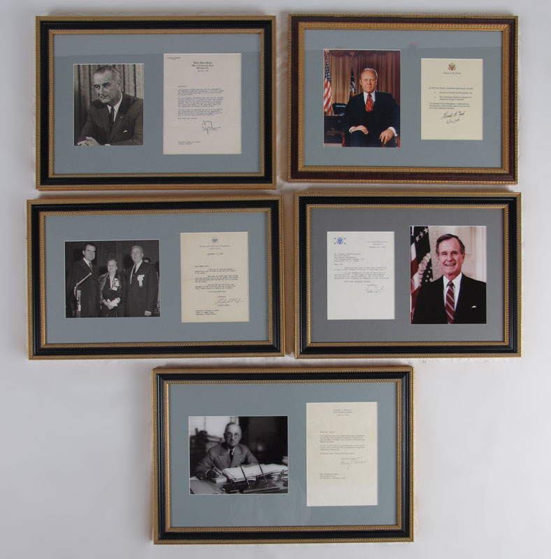 COLLECTION OF 5 FRAMED PRESIDENTIAL SIGNED LETTERS: To include George Bush Sr., Richard Nixon, Lyndon B. Johnson, Harry S. Truman, Gerald Ford. All are signed on typed letters, framed with photographs of the president. None are on White house stationary. Not examined out of frame. Largest framed measures 17 1/2'' x 25 1/2''.