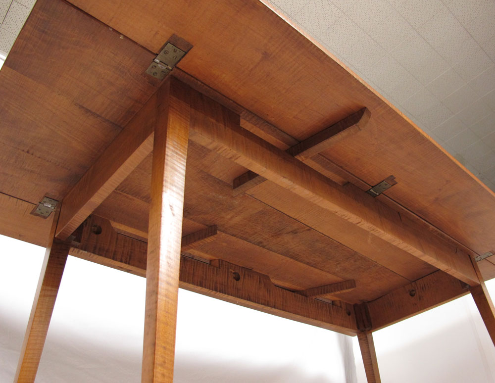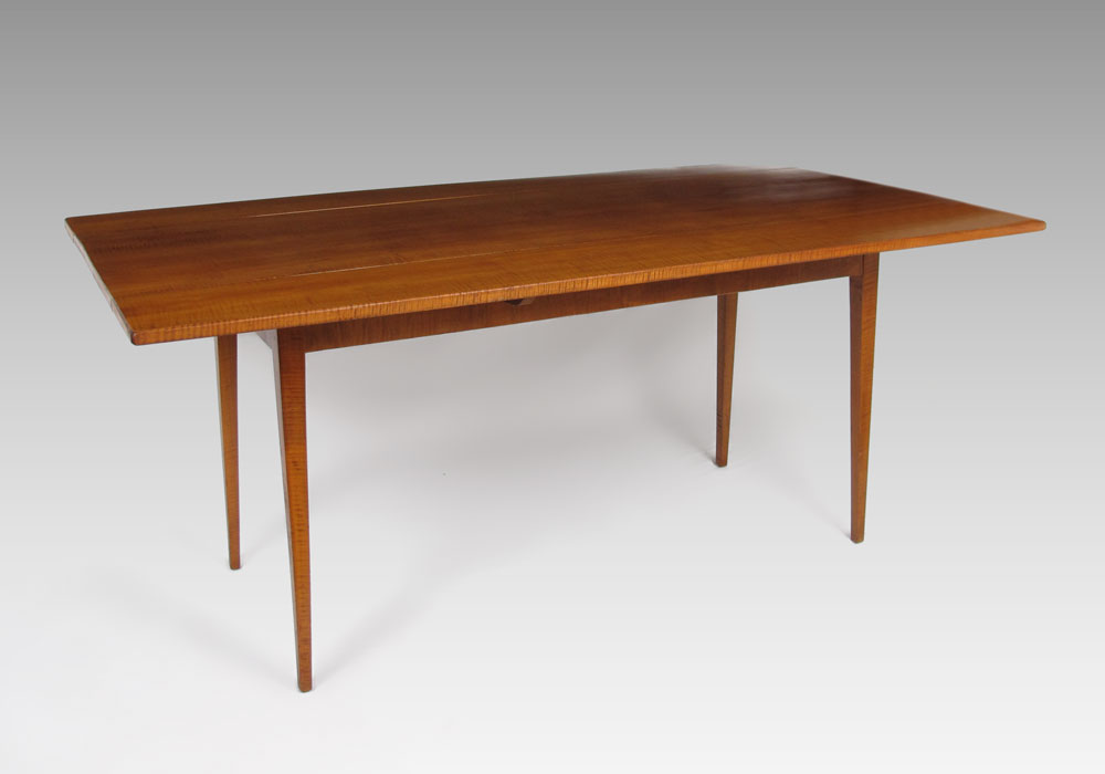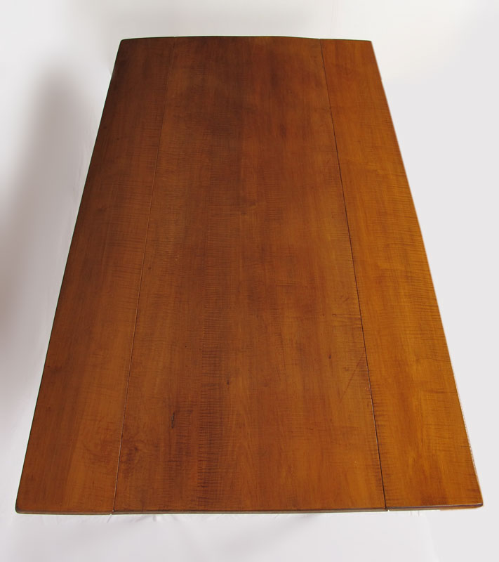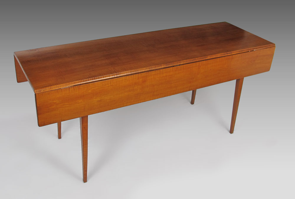 TIGER MAPLE DROP LEAF TABLE: Antique Hepplewhite Style long, hunt board or side board with drop leaf; straight tapered legs. Approx. Date: ca. 1840. Approx. 30 x 70 x 21 _ x 8'' drop.
