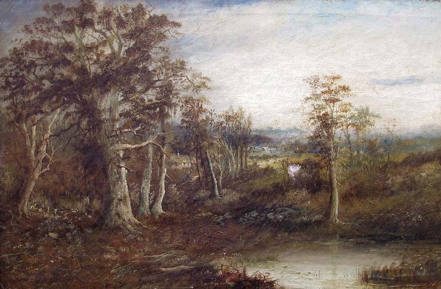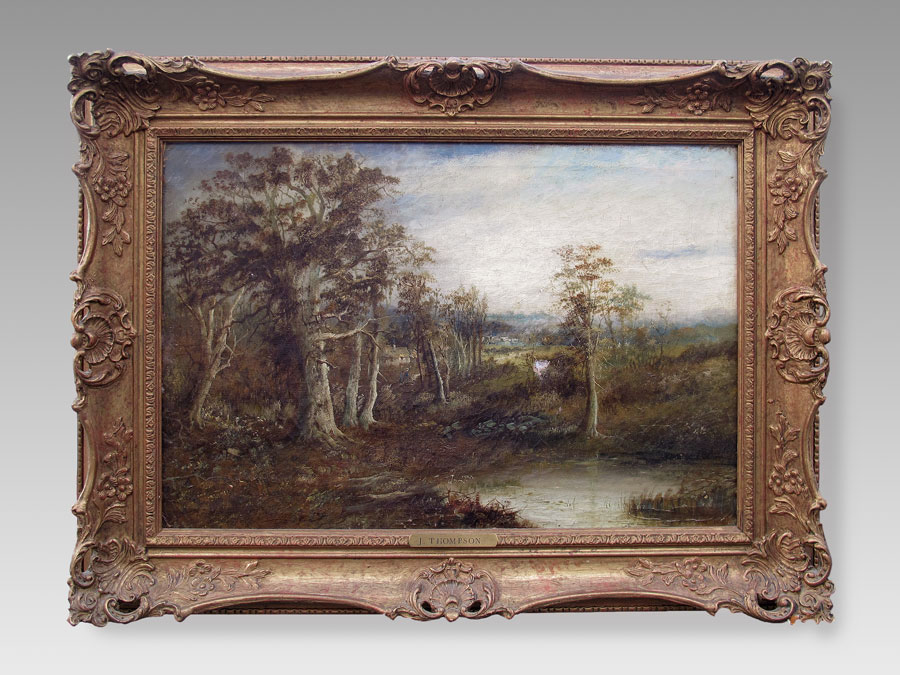 THOMPSON, J., (English School, 19th C.): Landscape with Stream and Village in Distance, OIL/Canvas, 16'' x 24'', pierced carved and gilded frame.