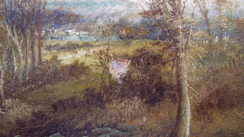 CONDITION: Cracklure throughout. Several patches with minor inpaint, hole will need patching.