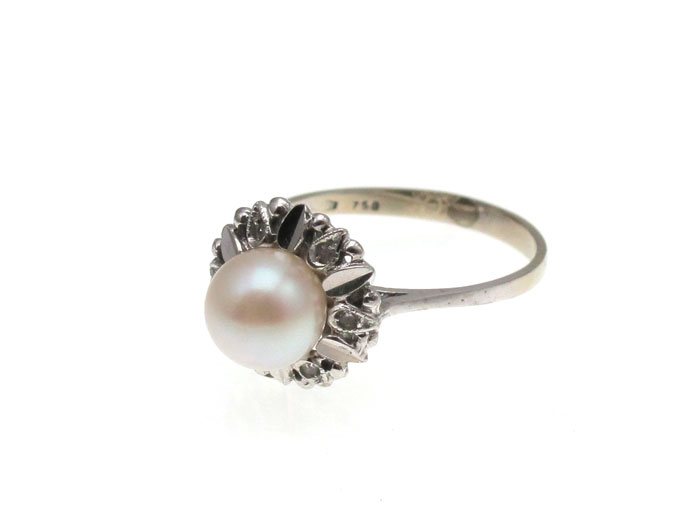 18K GOLD PEARL & DIAMOND RING: 18K white gold ring contains one 7.00 mm cultured pearl. White in color with low luster. Six round single cut diamonds. Weight: .06 Ct. Approx. The diamonds are deep set. The pearl is peg set. Weight: 2.8 grams. Size 6.5.