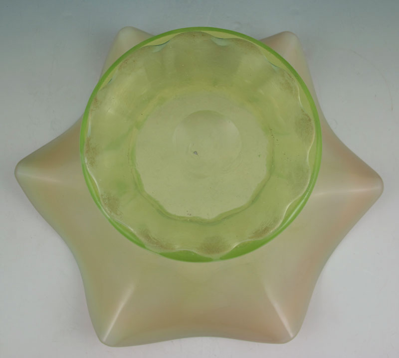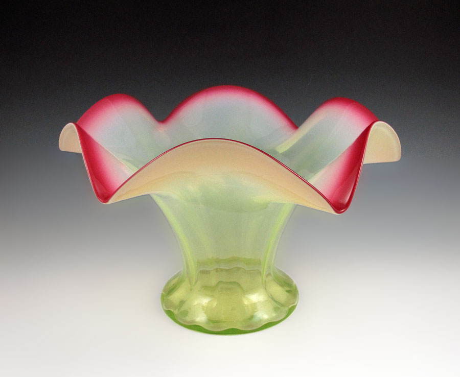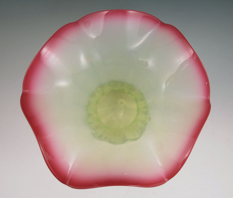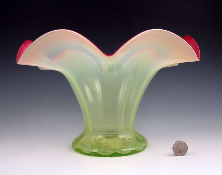 VASELINE GLASS CASE WITH CRANBERRY OPALESCENT SCALLOPED RIM: Approx. 7 1/4'' tall x 12'' dia.
