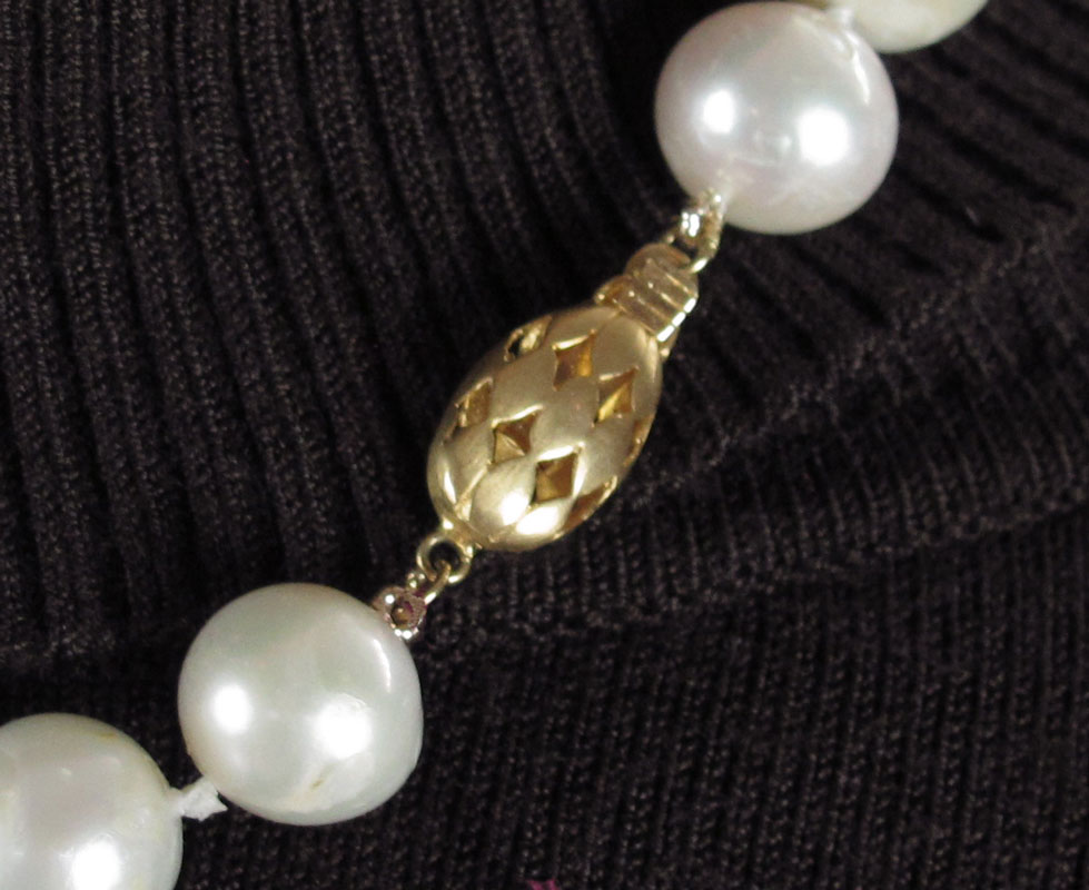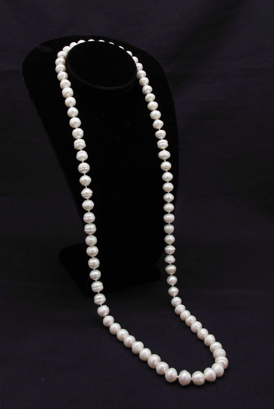 36'' STRAND FRESH WATER PEARLS; Irregular shaped pearls, approx. 10 mm. continuous hand knotted strand, no clasp.
