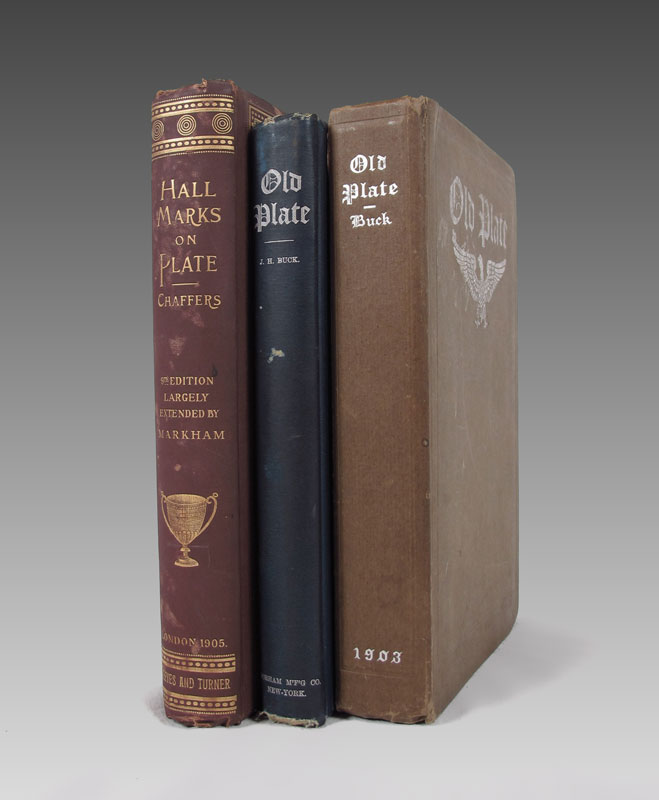 3 ANTIQUE BOOKS ON SILVER HALLMARKS AND PLATE: To include 1) Old Plate by J. H. Buck, published by The Gorham Manufacturing Co., 1888. Signed in front ''With Compliments, The Author''. 2) Old Plate by J. H. Buck, published by The Gorham Manufacturing Co., 1903. Signed in front ''Mr. R. S. Sly, with the thanks and compliments of J. H. Buck.'' 3) Hall Marks on Gold & Silver Plate by William Chaffers, published Reeves & Turner England, 1905.