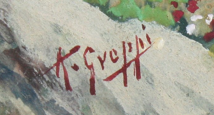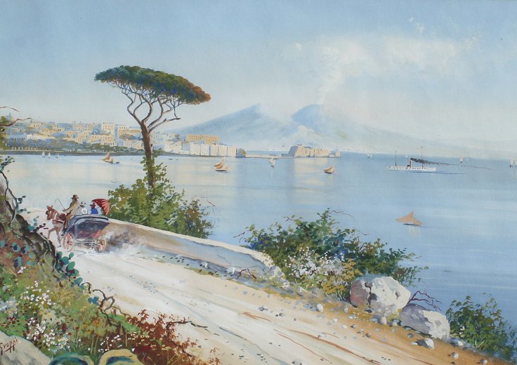 GREPPI, Antonio, (Italian, 19th Century): Vesuvius and the Bay of Naples, A Neapolitan Scene, Gouache, 11 3/4'' x 17'' sight size, signed, frame has wear, 18 1/2'' x 23 1/2''.