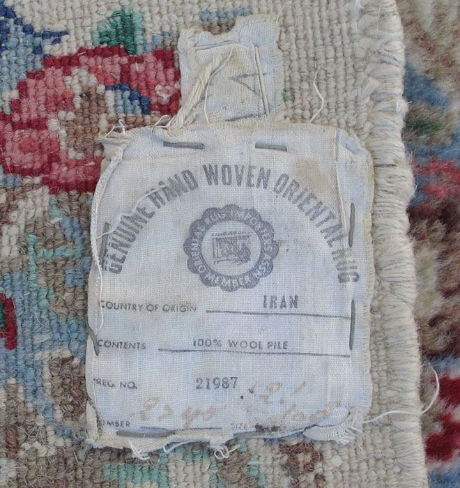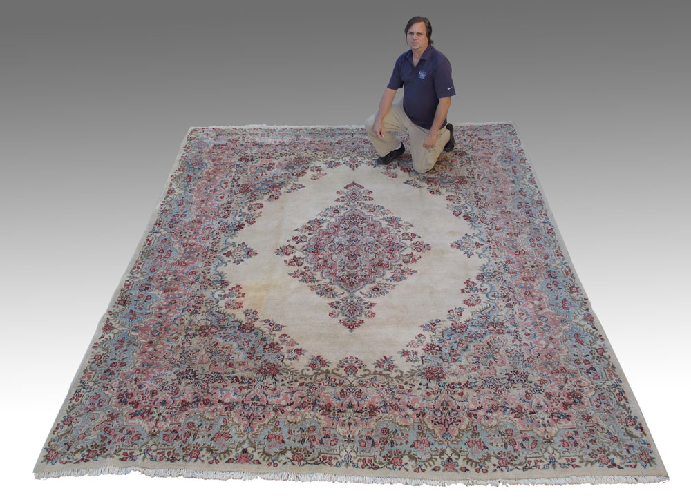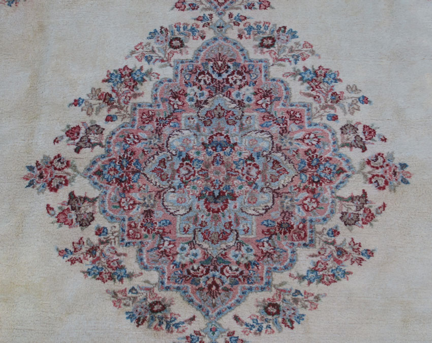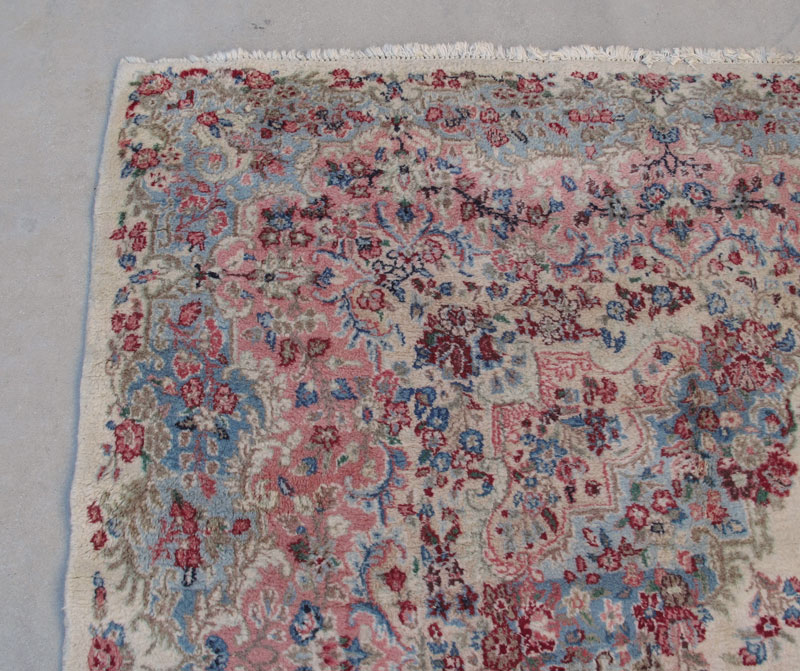 PERSIAN SEMI-ANTIQUE KERMAN HAND KNOTTED WOOL RUG, 10' x 12': This traditional design Kerman has a large open field with a medallion made up of sprays of pink and pale blue flowers mirrored by the design in the corners of the field. The colors of the corners of the field are carried to the borders giving the effect of a broken border.