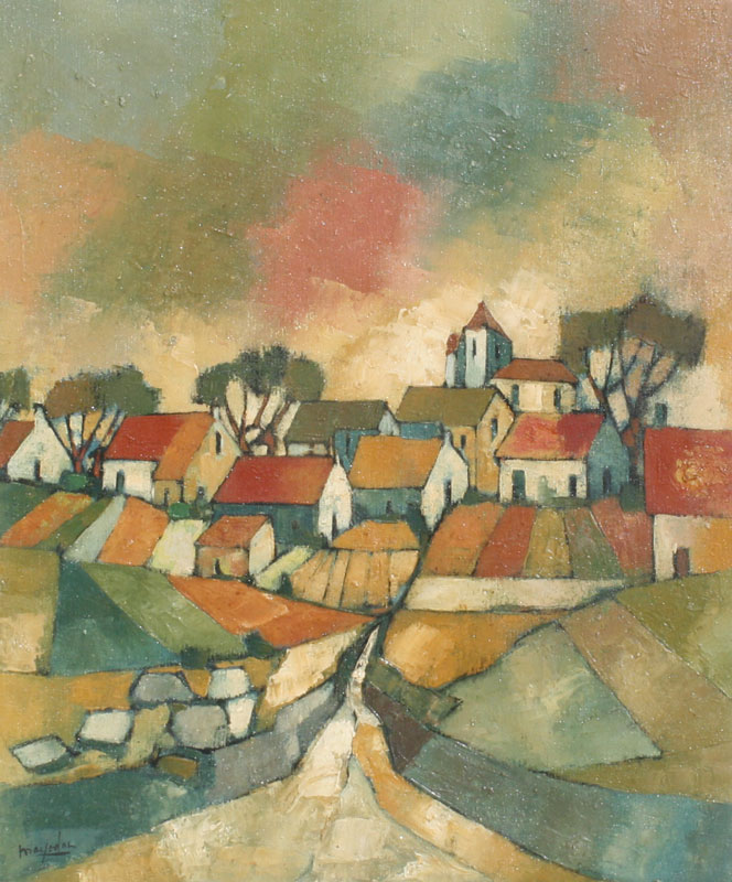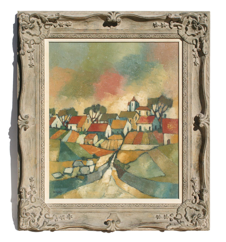 MAYODAN, Jean Claude, (French, 20th C.): Village Rooftops, OIL/Canvas, 24'' x 20'', signed, pierce carved frame with missing gesso, 32'' x 29''.