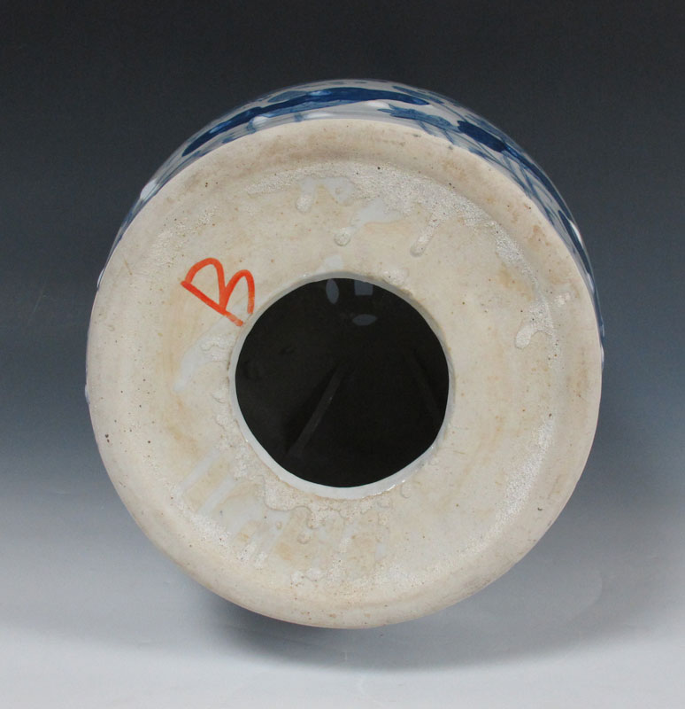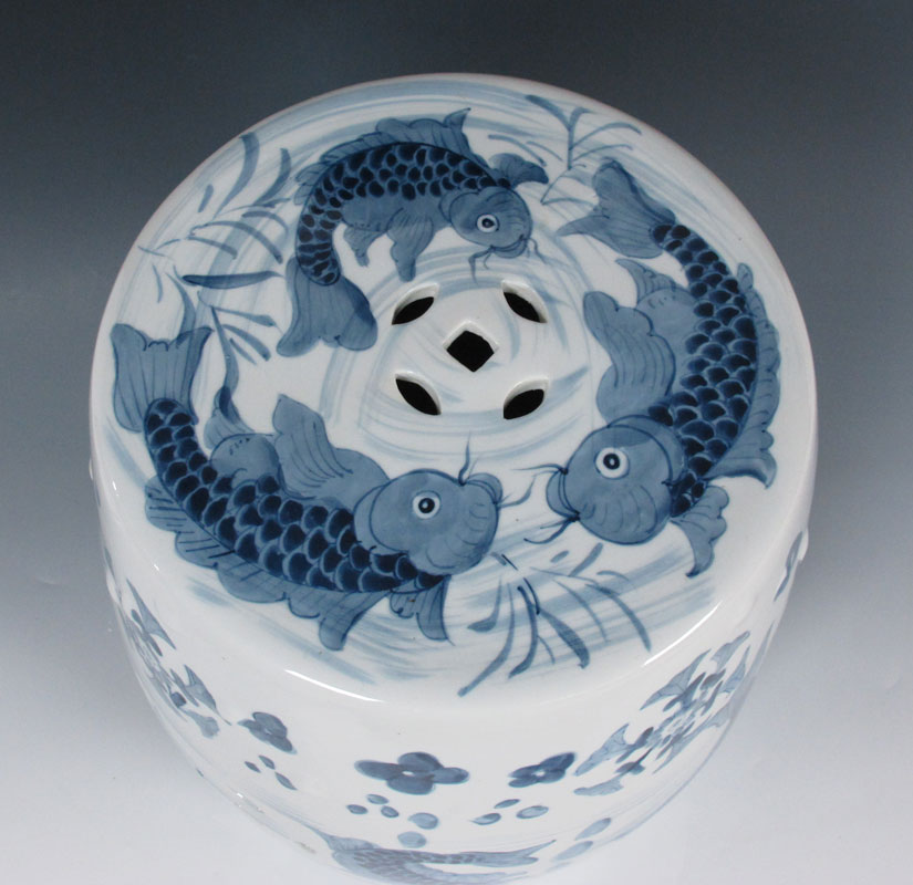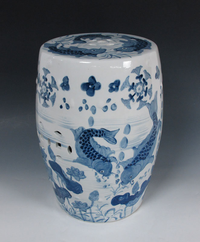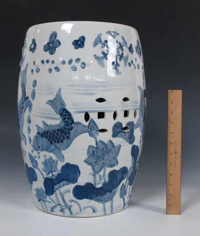 CHINESE GARDEN STOOL: Blue decorated with koi fish. Modern production. 18'' h. x 12'' dia.