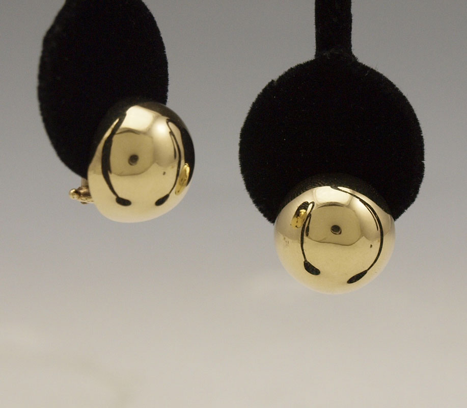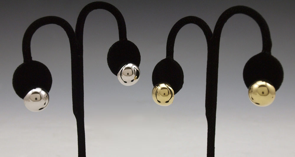 TWO PAIR 14K GOLD BUTTON EARRINGS: 1) 14K white gold button earrings measure approx. 5/8'' in diameter. Post and hinged clip closures. Weight: 5.3 grams. 2) 14K yellow gold button earrings measure approx. 5/8'' in diameter. Post and hinged clip closures. Weight: 5.3 grams. TOTAL WEIGHT 10.6 grams.