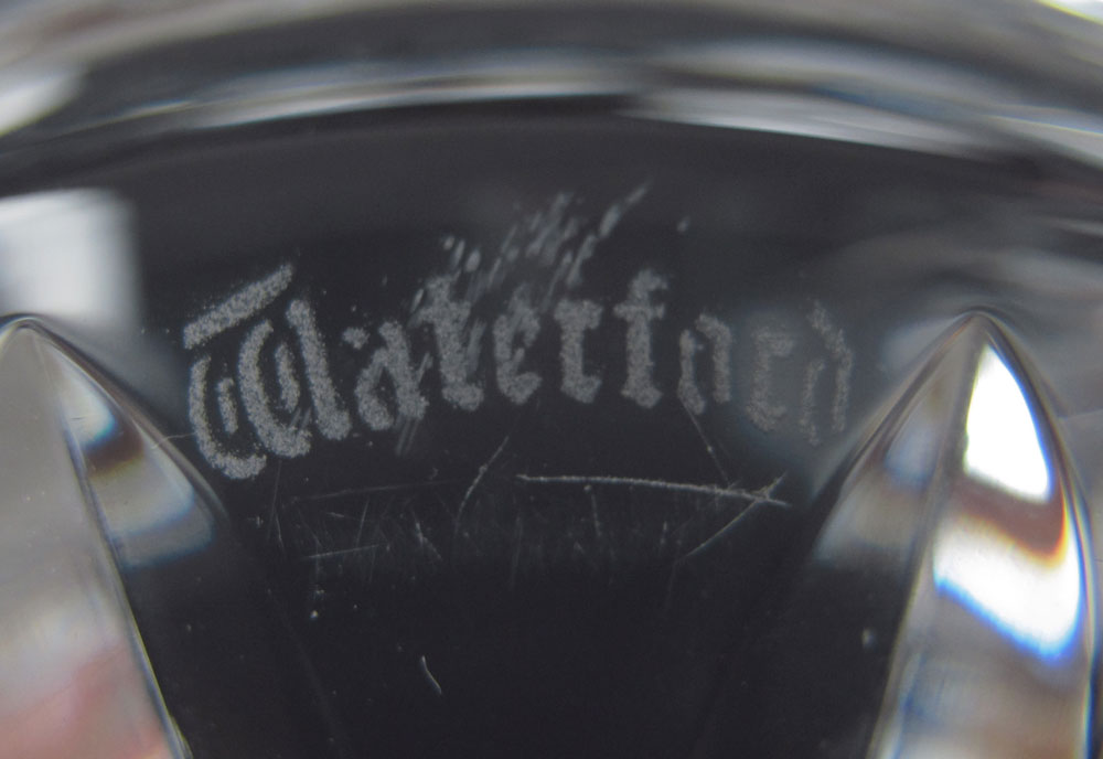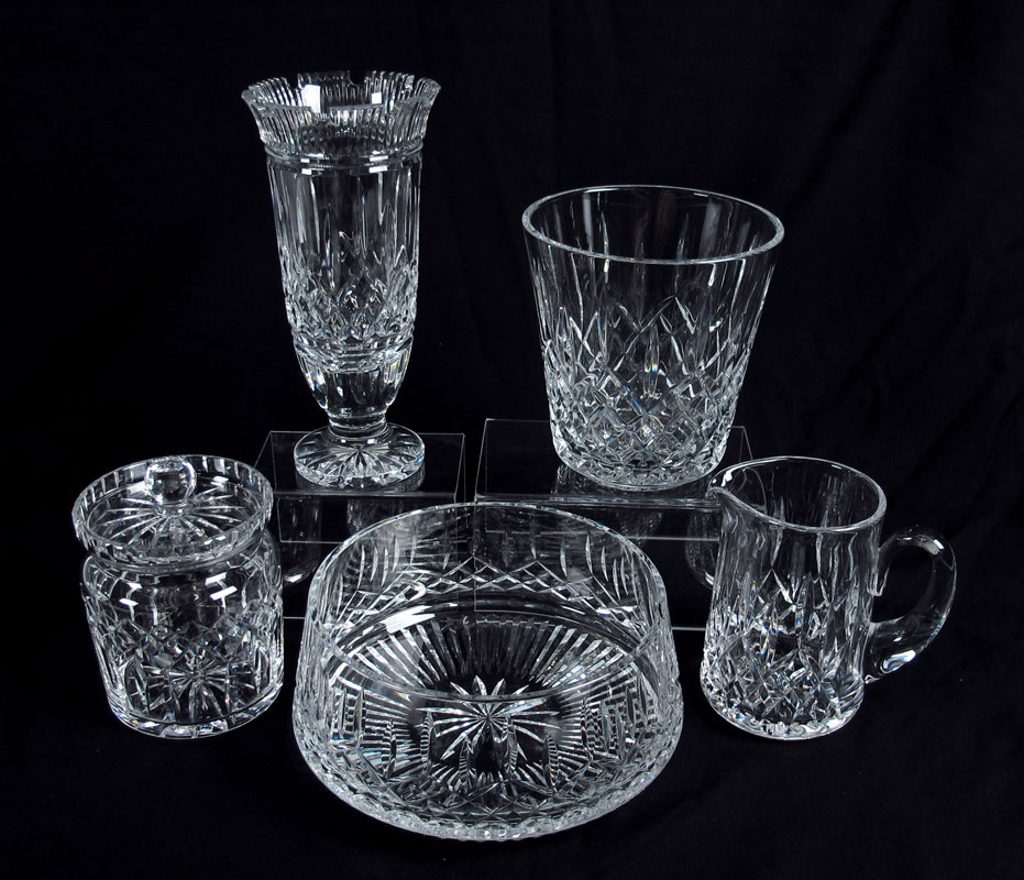 SIGNED WATERFORD LISMORE GROUP: 1) Ice bucket, 7 1/4''. 2) Salad Bowl, 8 1/2'' dia. 3) Castle Vase, 11''. 4) Pitcher, 6 1/2''. 5) Biscuit Barrel, 6''.