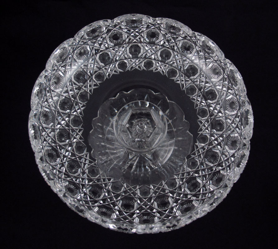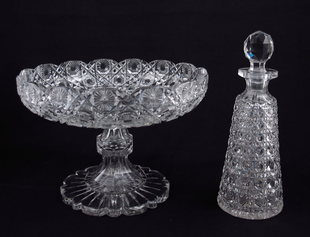 BRILLIANT PERIOD CUT GLASS COMPOTE AND BOTTLE: 1) Cane motif bottle with stopper, approx. 9'' tall. 2) Pedestal compote, on scalloped base, approx. 6 1/2'' tall x 9 1/4'' dia.
