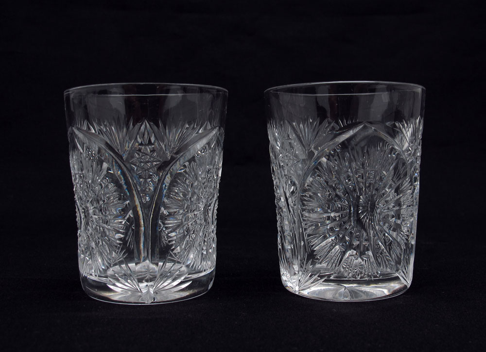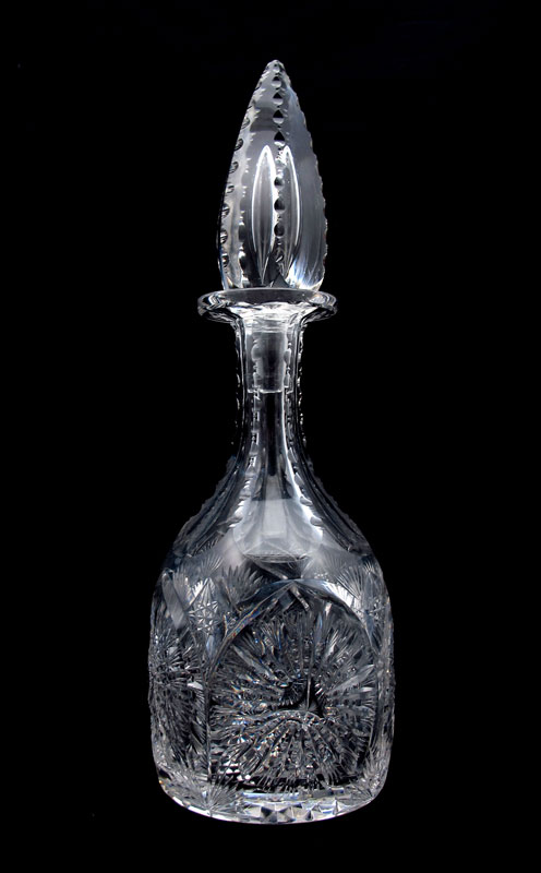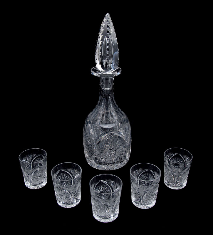 CUT GLASS LIQUOR DECANTER AND 5 CORDIALS: To include 1) Cut glass liquor decanter with large spire stopper. Unsigned, 13 1/4'' h. x 4 1/4''. 2) 5 unsigned cut glass cordials 2 3/4'' h. x 2 1/4'' dia.