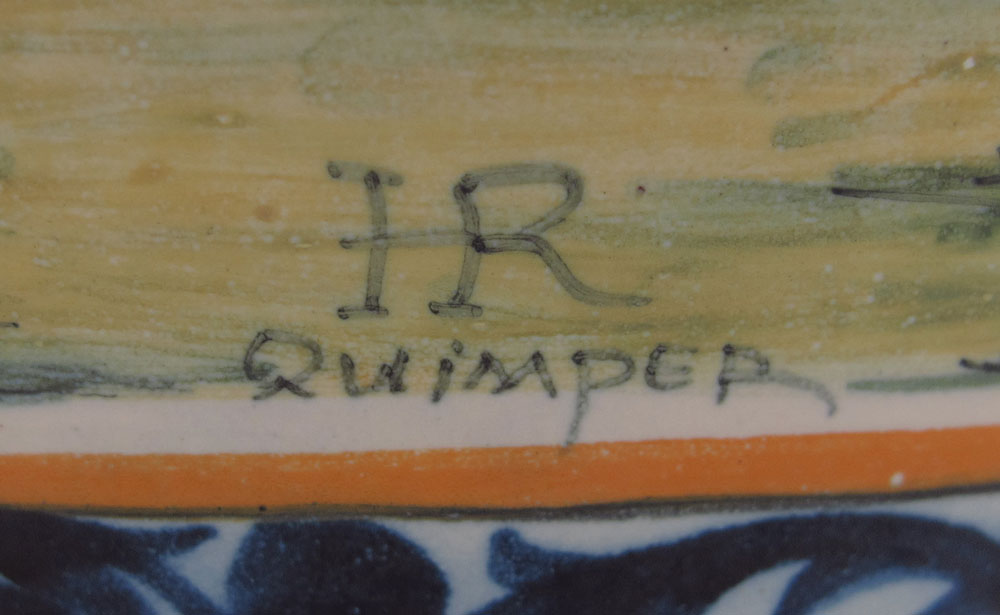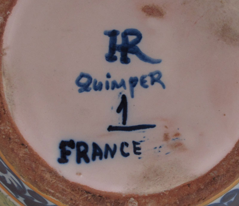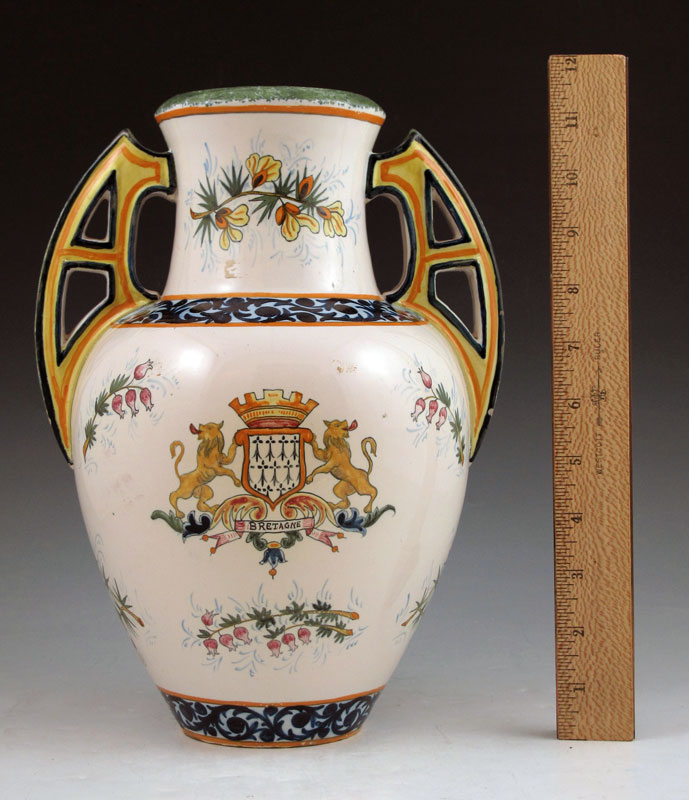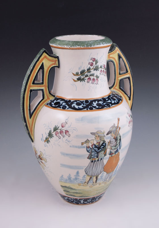 QUIMPER FRENCH FAIENCE DOUBLE HANDLE VASE: Hand painted musician motif with pink heather, heraldic crest verso. 11 1/2'' tall. Signed HR Quimper 1 France.