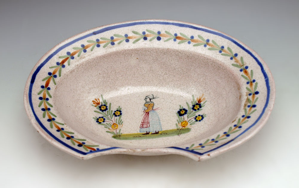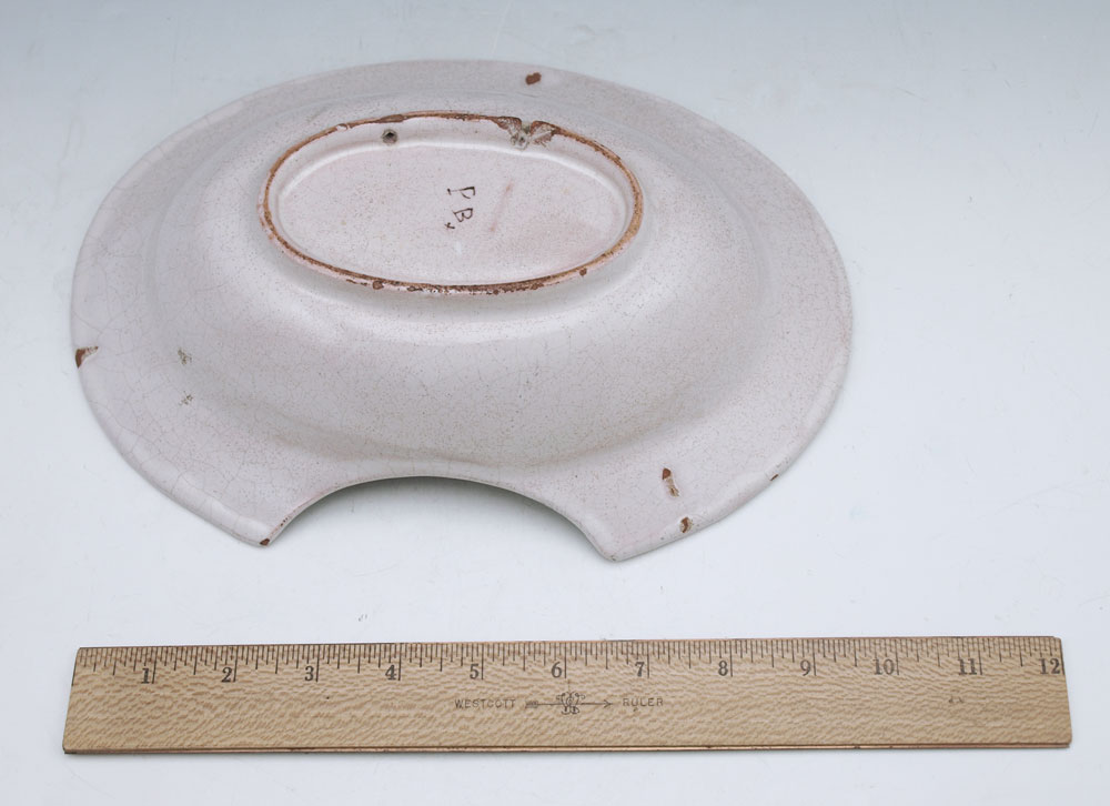 MALICORNE Pbx FRENCH FAIENCE SHAVING BOWL: Pouplard - Beatrix factory in Malicorne France. PBx mark. 2 1/4''h. x 10 1/2''l.