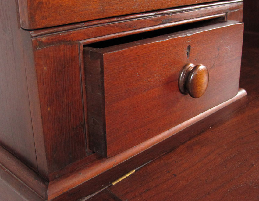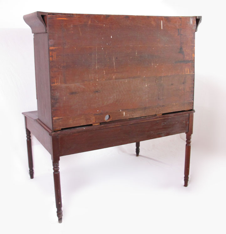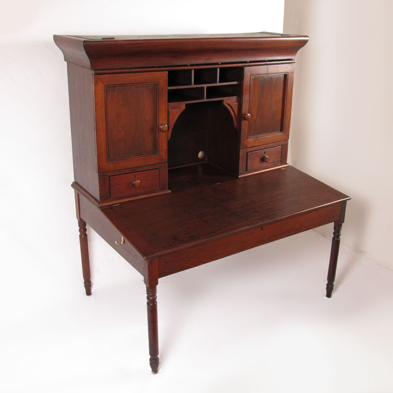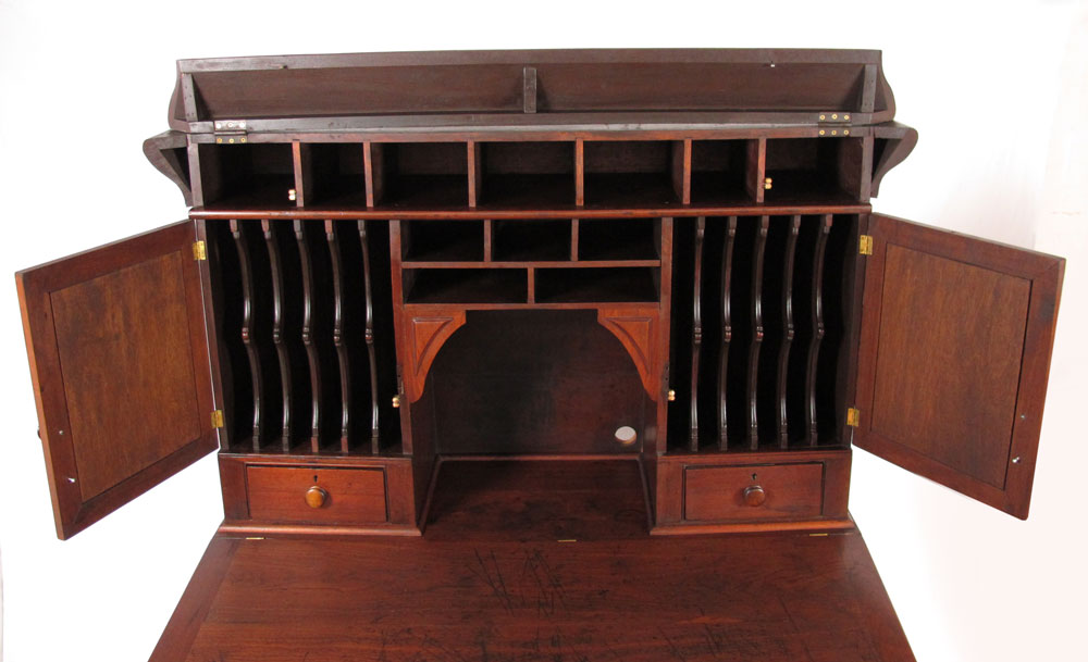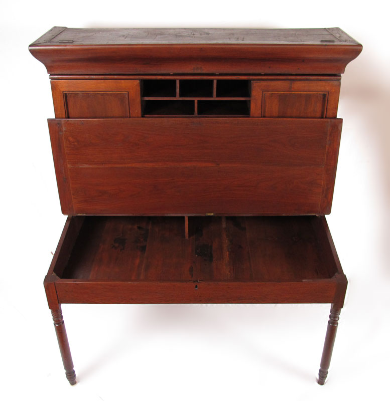 19TH C PLANTATION DESK WITH CHAIR: Top valence opens to reveal hidden cubby holes. 2 doors with drawers with center pigeon holes top piece. Lift top base. 64 1/4'' h. x 55'' x 37 1/2''.