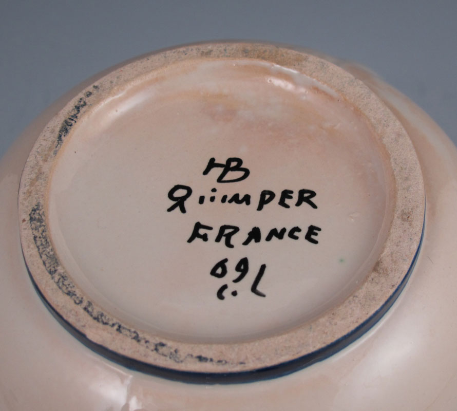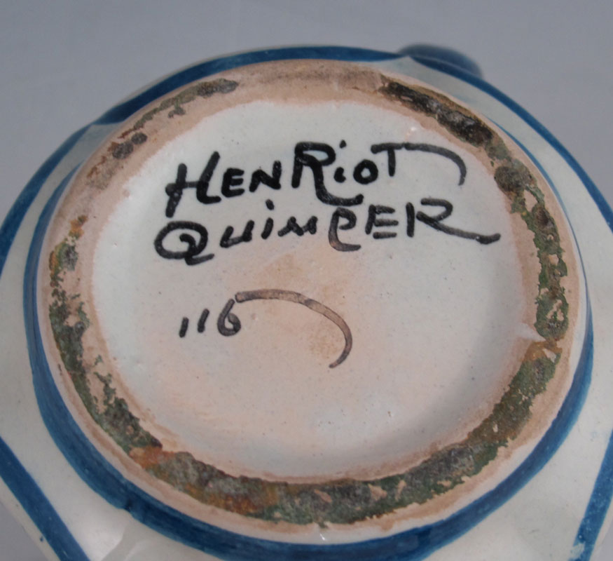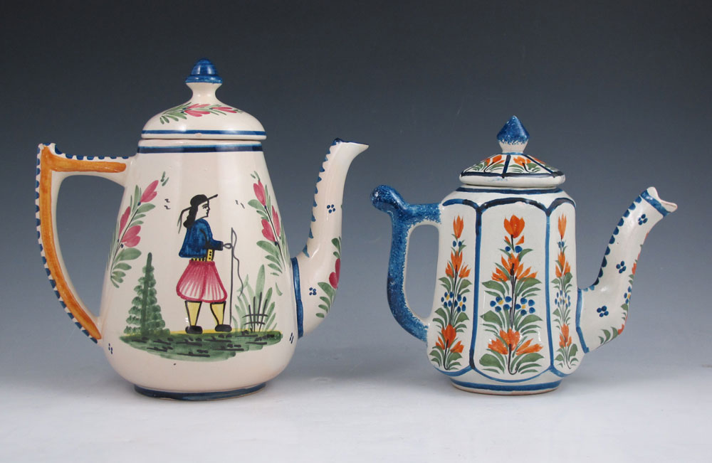 TWO QUIMPER FRENCH FAIENCE TEAPOTS: 1) Paneled side pot with woman Breton, signed Henriot Quimper, 6''. 1) Man Breton decorated pot, 8'', HB Quimper France.