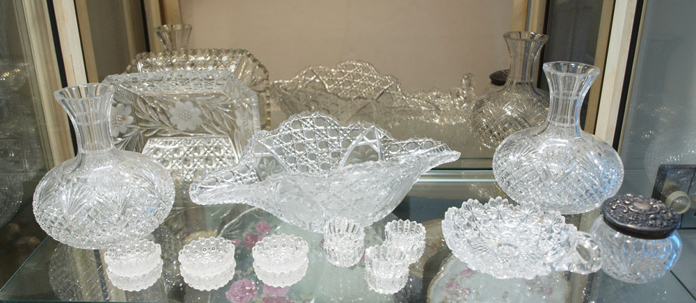 18 PIECE GLASS LOT; Mostly cut glass. Decanter, banana bowl, tray and salts. Provenance: Raymond Sobota Estate .