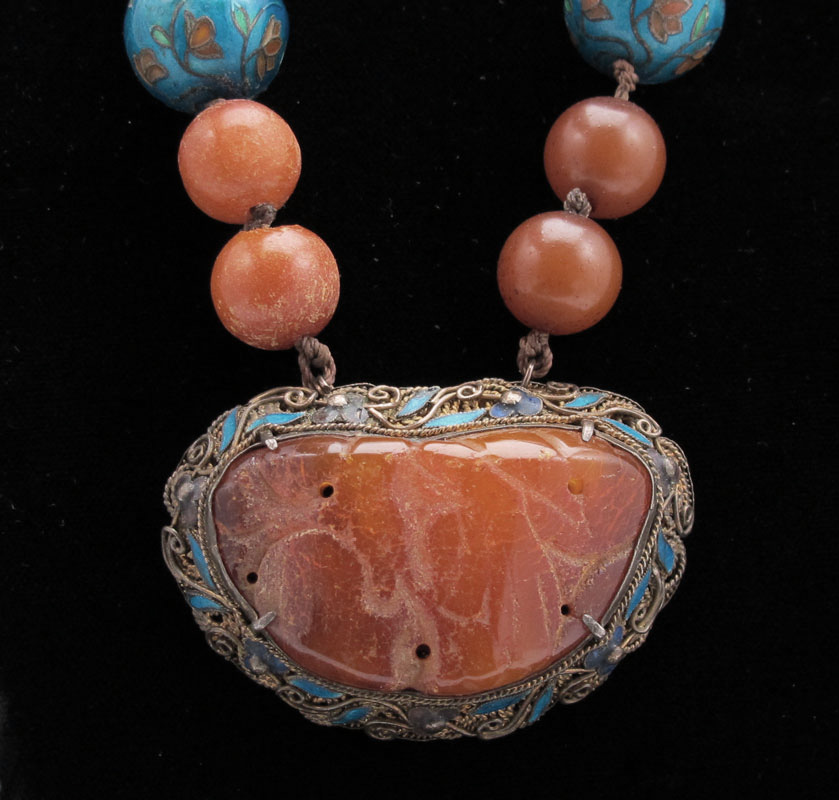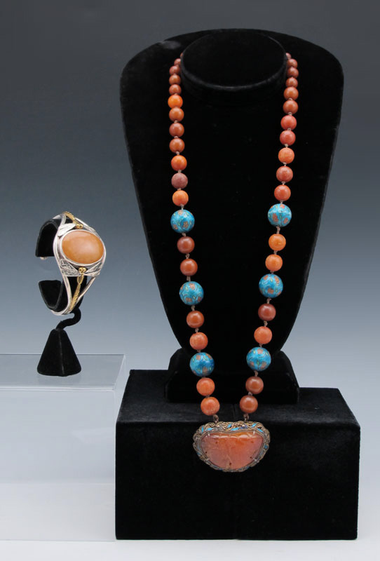 CHINESE AMBER AND ENAMEL NECKLACE: Sold together with a contemporary sterling dragonfly bracelet, amber beads and an amber pendant on chain.