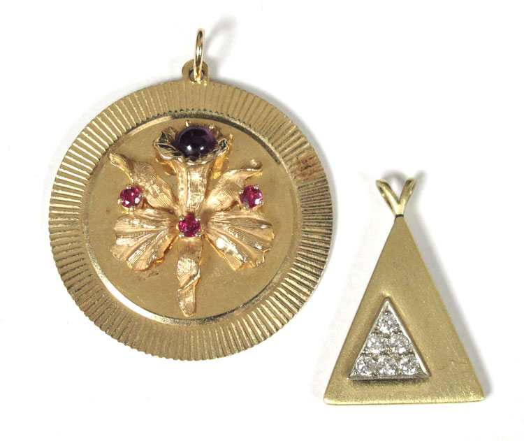 TWO 14K GOLD PENDANTS: 14K orchid on disc contains amethyst and synthetic ruby. Triangle pendant contains six round brilliant cut diamonds. Weight: .25 Ct. Approx. Rated VS in clarity and G-H in color. Weight: 16.3 grams.