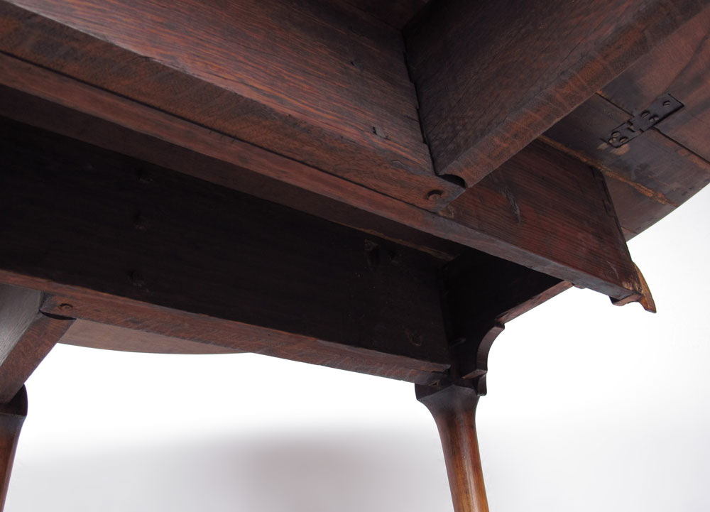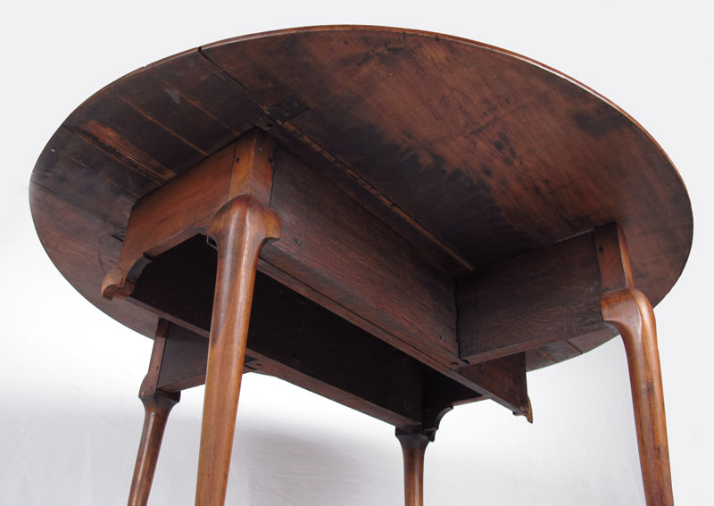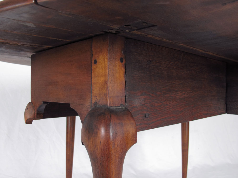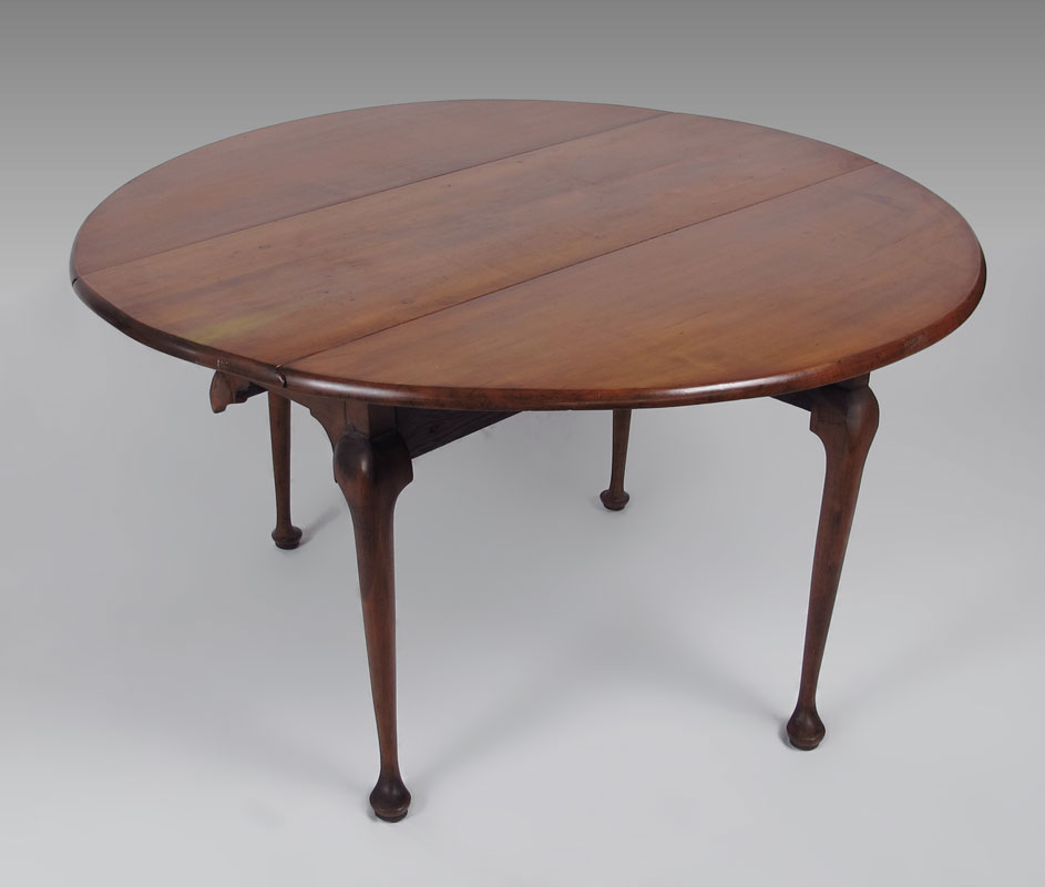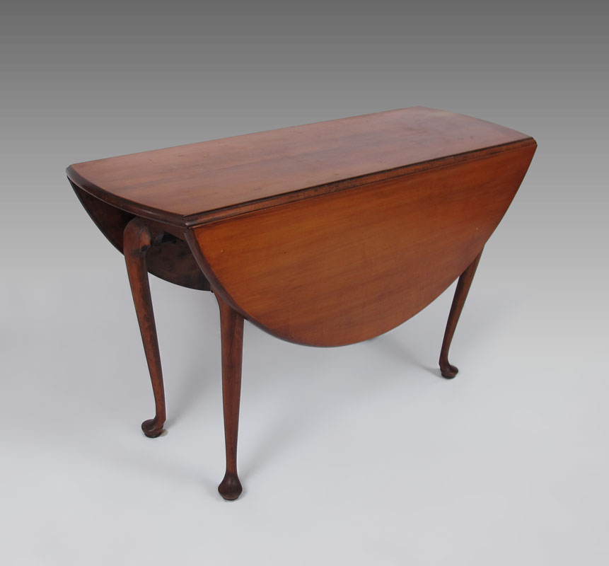 ANTIQUE QUEEN ANNE DROP LEAF TABLE: Queen Anne Form long, oval table with slender cabriole legs terminating on pad feet. Approx. 27 x 16 x 48 x 15 drop leaf.
