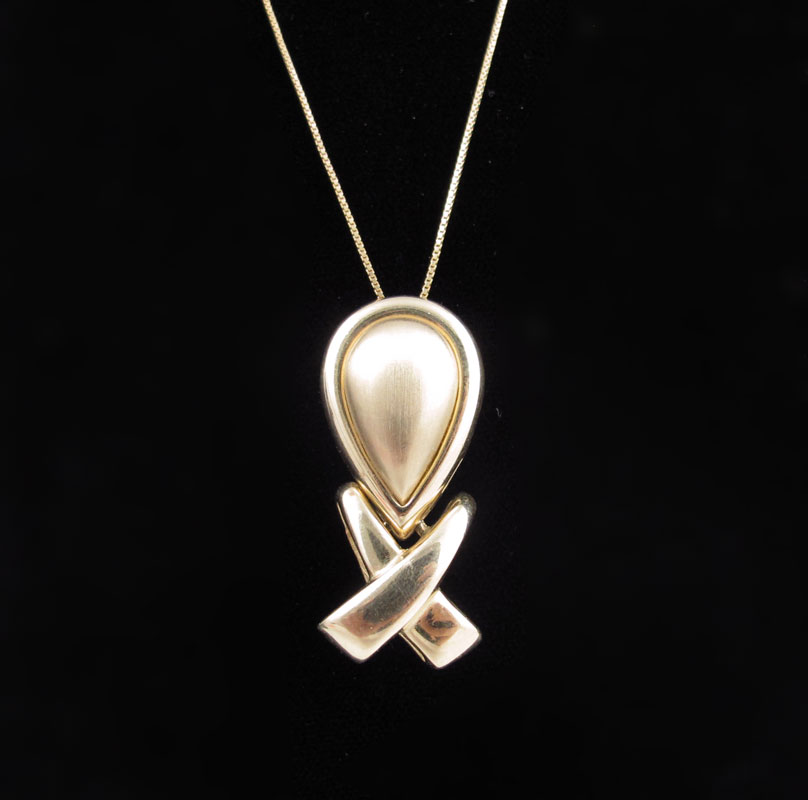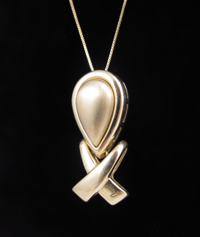 14K GOLD PENDANT AND CHAIN: 14K yellow gold pendant with box chain. Length: 16'' Weight: 8.5 grams.
