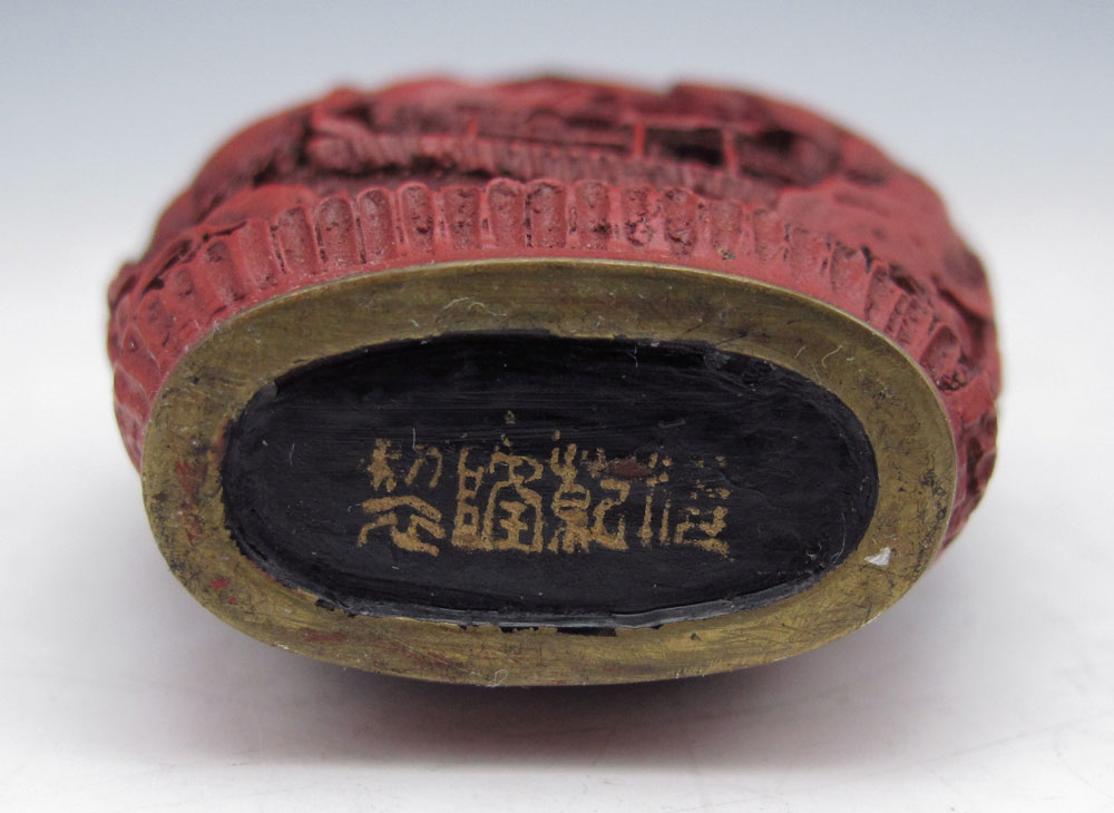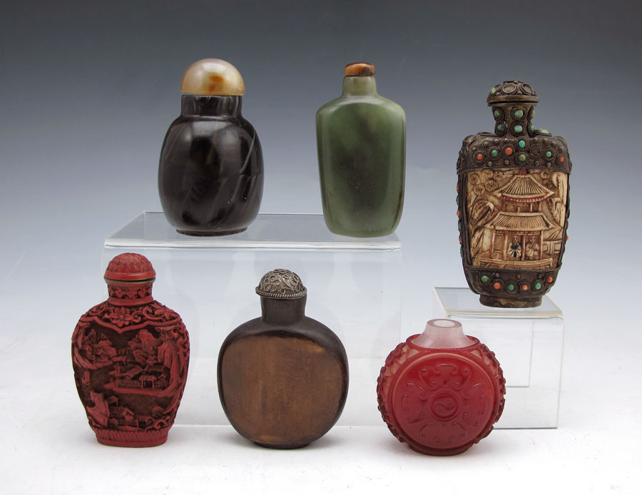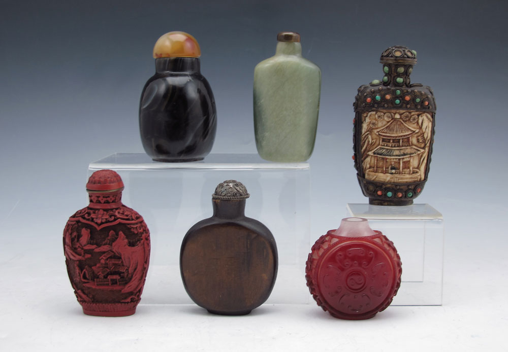 COLLECTION OF 6 CHINESE SNUFF BOTTLES: To include 1) Metal frame with inlaid stone accents and carved bone panels, note damage, 3 3/4'' h. Metal spoon. 2) Cinnabar with carved town scenes, signed, 3'' h., ivory spoon. 3) Smooth green hard stone, 3'' h., ivory spoon. 4) Smooth dark swirl hard stone, 3'' h., ivory spoon. 5) Smooth wood with metal top, 2 7/8'' h. metal spoon. 6) Red glass overlay, missing top, 2'' h.