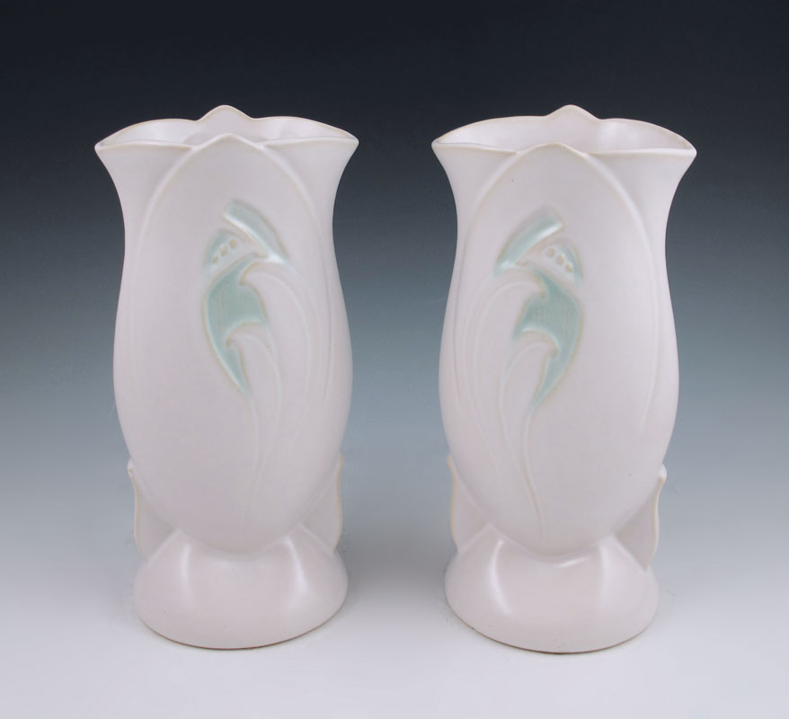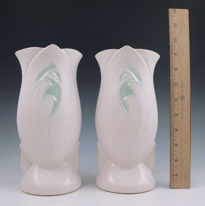 PAIR ROSEVILLE SILHOUETTE VASES: 785-9''. Cream with green.