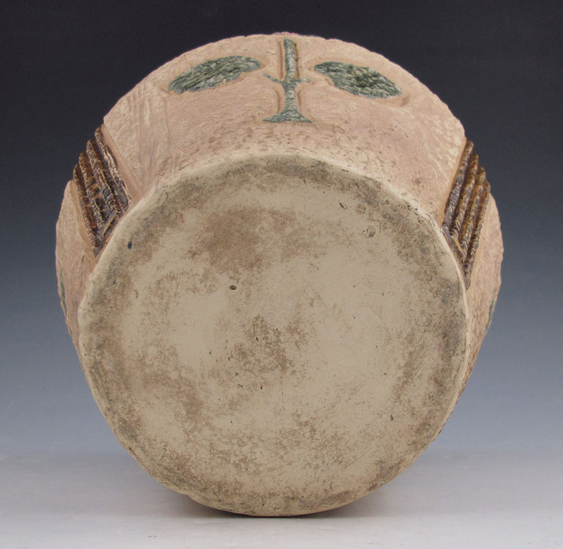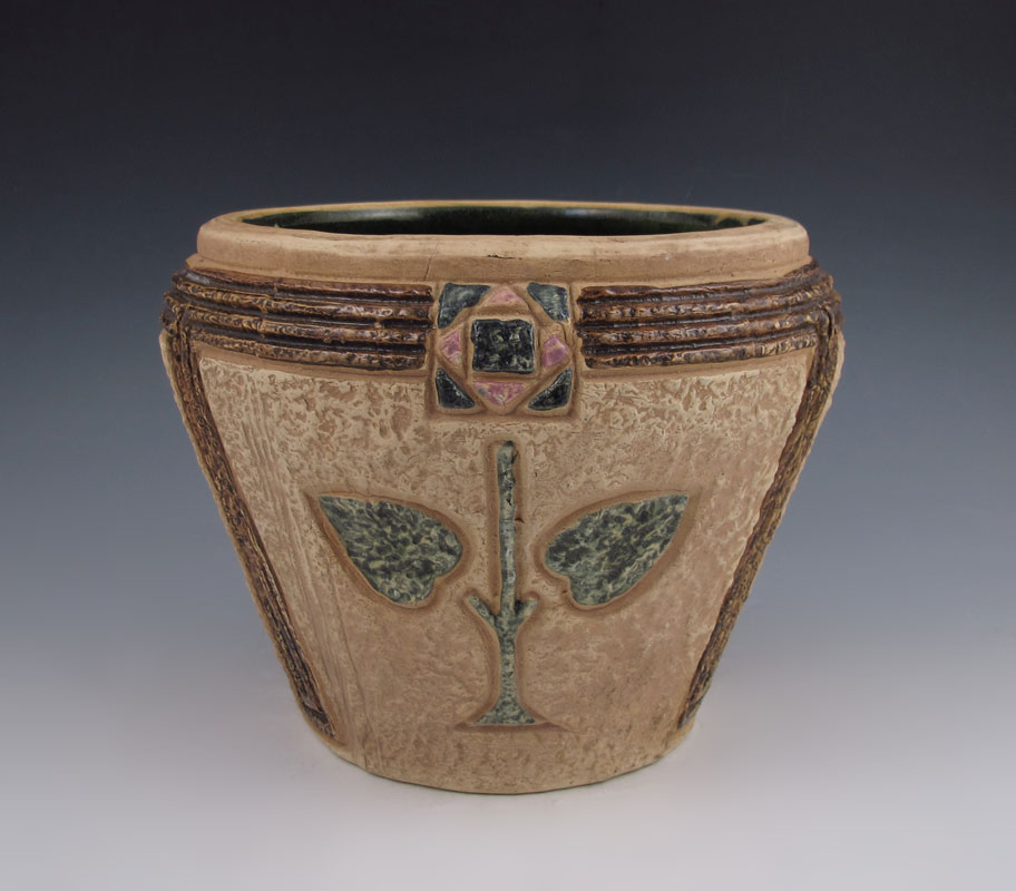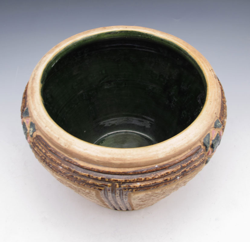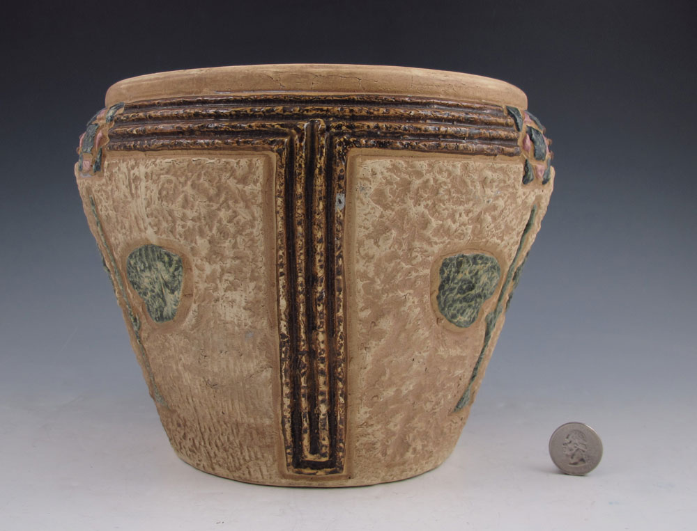 ROSEVILLE POTTERY MOSTIQUE JARDINIERE: Early 19oo's Arts & Crafts design, 8'' dia., 7'' tall.